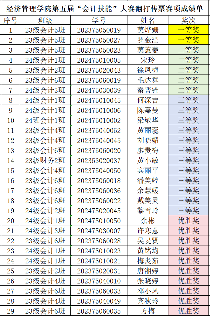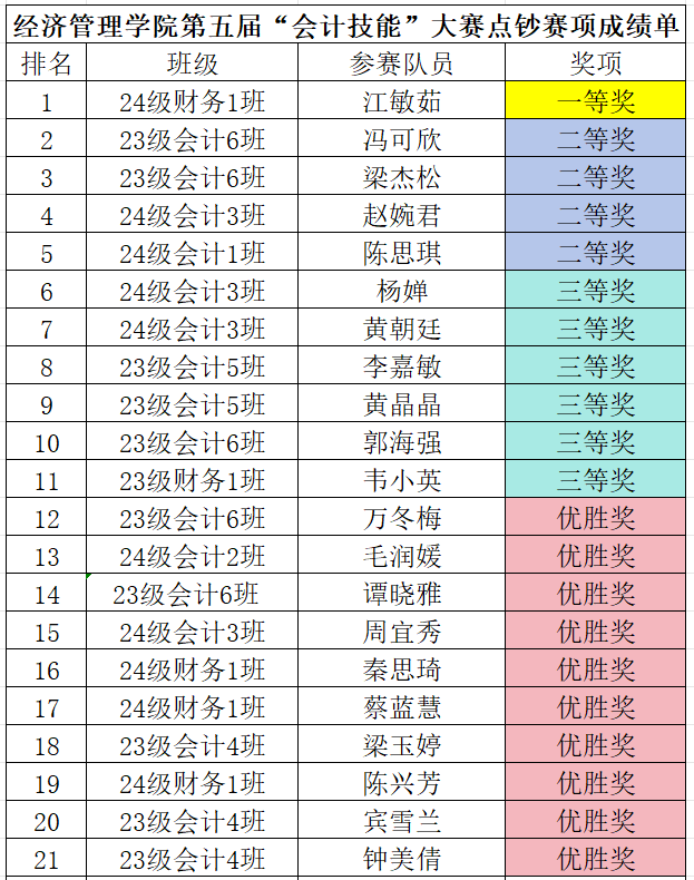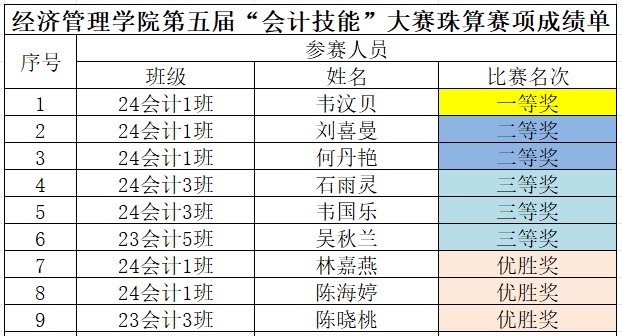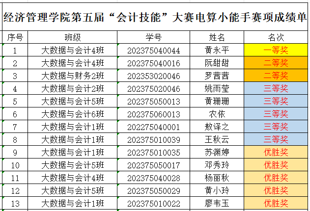 第五屆會計技能大賽獲獎名單