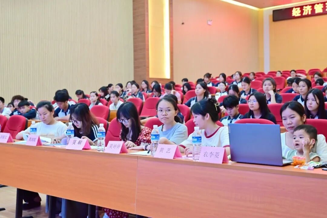 經(jīng)濟(jì)管理學(xué)院黨支部副書(shū)記潘翠萍及學(xué)院教師出席比賽現(xiàn)場(chǎng)。擔(dān)任此次比賽的評(píng)委有:彭麗文老師、吳嶄老師、莫清妮老師、李林蔚老師、李銀老師。