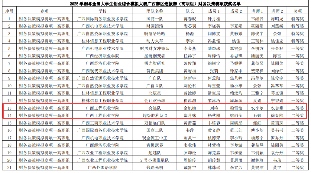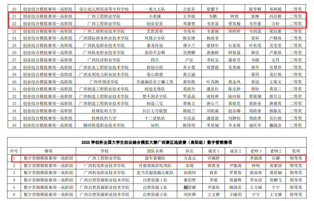 6月27日—28日,2025年第十二屆“學創(chuàng)杯”全國大學生創(chuàng)業(yè)綜合模擬大賽廣西賽區(qū)選拔賽(職教組)在柳州職業(yè)技術大學舉行,本次選拔賽共有32所高校、500余師生參與競賽。廣西工程職業(yè)學院經(jīng)濟管理學院石娜和徐春陸,鐵道與航空學院徐琳和韋丹蕾共4位老師帶領2023級大數(shù)據(jù)與會計專業(yè)黃菲、2023級電子商務專業(yè)鄭誠、2023級城市軌道交通工程技術專業(yè)方益元、2023級學前教育專業(yè)許婉婷等26名同學參加此次比賽,通過不懈努力,榮獲