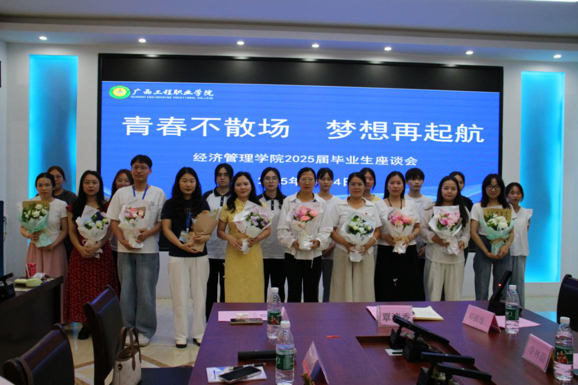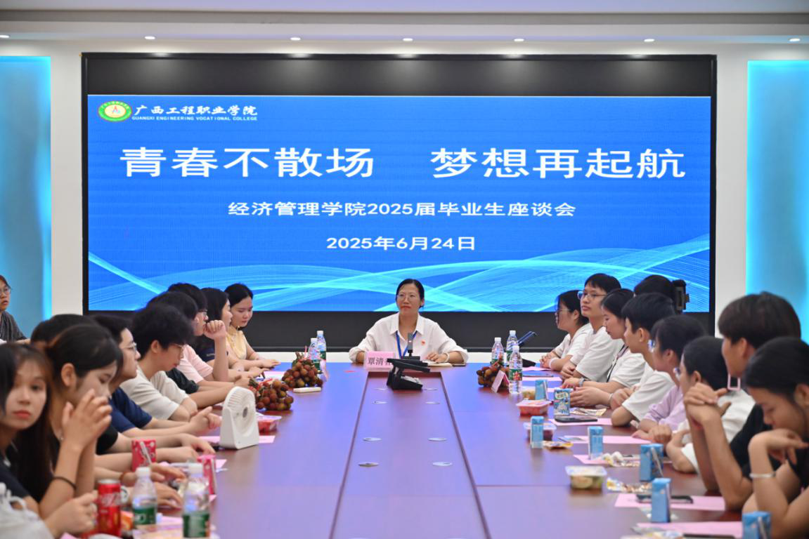 2025年6月24日下午,經(jīng)濟管理學(xué)院召開“青春不散場·夢想再啟航”2025屆畢業(yè)生座談會,學(xué)院黨支部書記、院長覃清香,分團委書記謝彩英,辦公室主任鄧鎮(zhèn)連,2025屆畢業(yè)班輔導(dǎo)員,財會專業(yè)教師農(nóng)李菱,電子商務(wù)專業(yè)教師李林蔚參加此次座談會,學(xué)院來自各個專業(yè)的68名畢業(yè)生代表與現(xiàn)場的領(lǐng)導(dǎo)老師現(xiàn)場對話,暢談一路成長與收獲,共話學(xué)院的改革與發(fā)展,展望人生憧憬與未來。