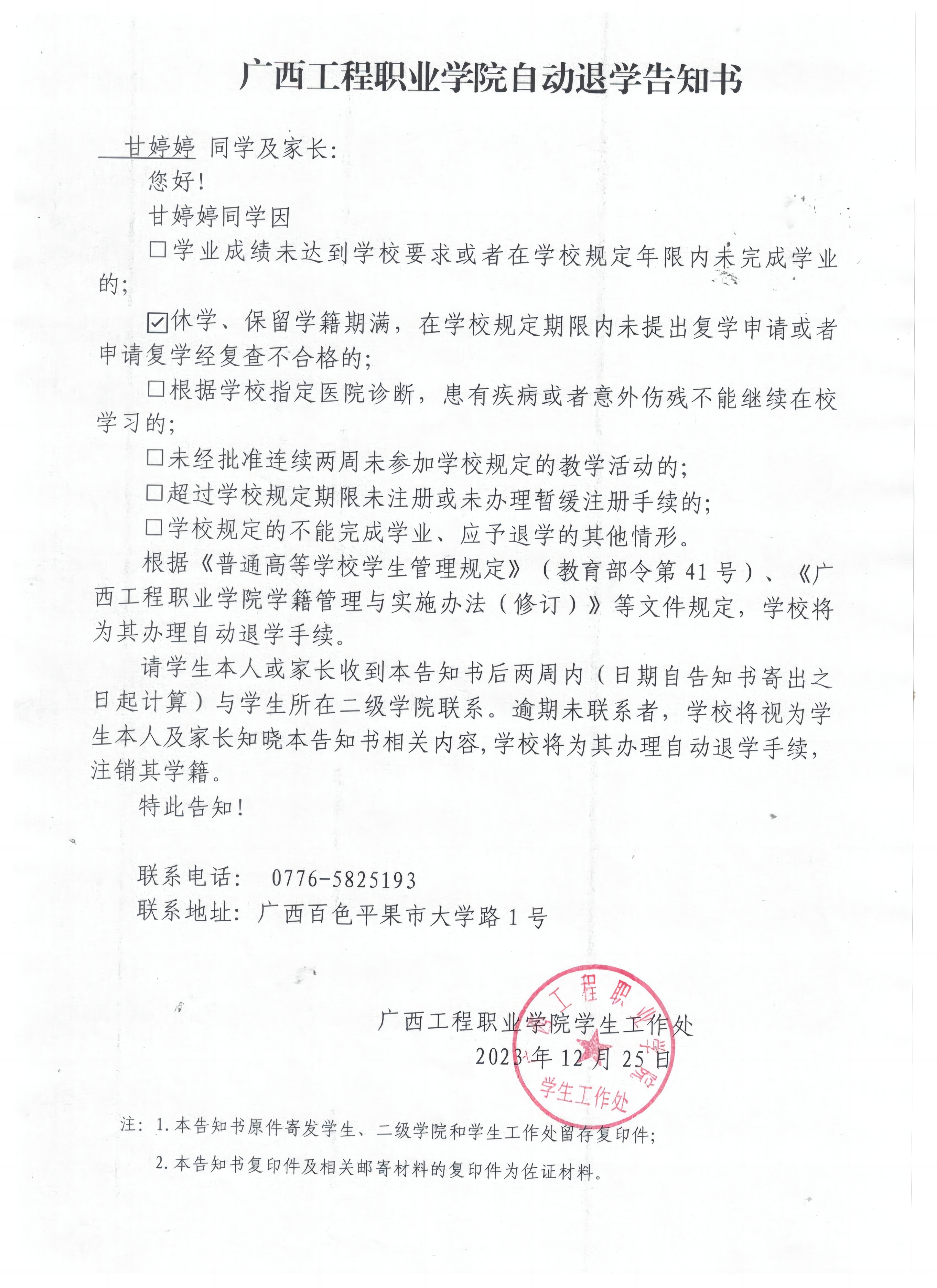 下一篇:廣西工程職業(yè)學(xué)院自動退學(xué)告知書/經(jīng)濟(jì)管理學(xué)院