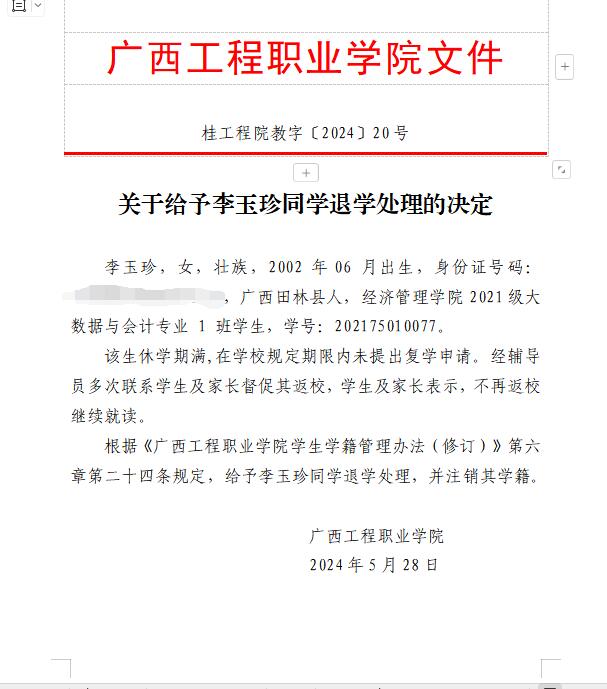 根據(jù)《普通高等學(xué)校學(xué)生管理規(guī)定》(教育部令第41號(hào))、《廣西工程職業(yè)學(xué)院學(xué)生學(xué)籍管理辦法(修訂)》第二十四條規(guī)定,給予李玉珍同學(xué)退學(xué)處理,并注銷其學(xué)籍。