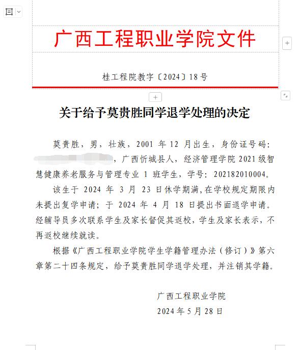 根據(jù)《普通高等學校學生管理規(guī)定》(教育部令第41號)、《廣西工程職業(yè)學院學生學籍管理辦法(修訂)》第二十四條規(guī)定,給予莫貴勝同學退學處理,并注銷其學籍。