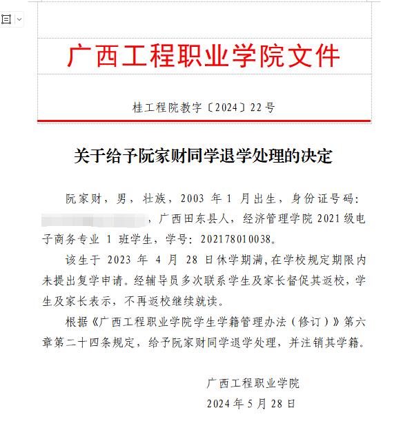 根據(jù)《普通高等學(xué)校學(xué)生管理規(guī)定》(教育部令第41號(hào))、《廣西工程職業(yè)學(xué)院學(xué)生學(xué)籍管理辦法(修訂)》第二十四條規(guī)定,給予阮家財(cái)同學(xué)退學(xué)處理,并注銷其學(xué)籍。