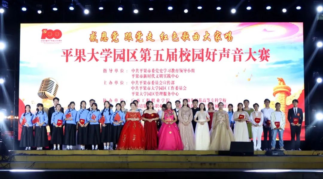 百年征程波瀾壯闊,百首紅歌頌贊初心。為推動(dòng)黨史學(xué)習(xí)教育走深走實(shí),以?xún)?yōu)異成績(jī)獻(xiàn)禮黨的百年華誕,2021年6月18日,平果市“感黨恩跟黨走紅色歌曲大家唱——平果大學(xué)園區(qū)第五屆校園好聲音大賽”決賽在平果市文化公園舉行,我校師生積極參加,并取得銀獎(jiǎng)2項(xiàng)、銅獎(jiǎng)1項(xiàng)、優(yōu)勝獎(jiǎng)1項(xiàng)的好成績(jī)。