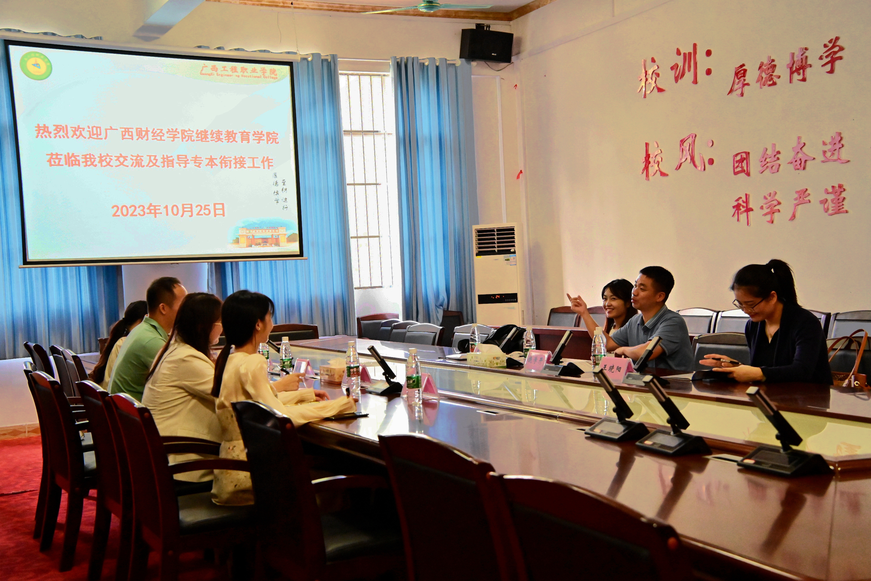 為更好的開展專本銜接合作項(xiàng)目,進(jìn)一步保障和提升人才培養(yǎng)質(zhì)量,10月25日,我校邀請(qǐng)廣西財(cái)經(jīng)學(xué)院繼續(xù)教育學(xué)院的領(lǐng)導(dǎo)、老師來(lái)校交流指導(dǎo)專本銜接工作。