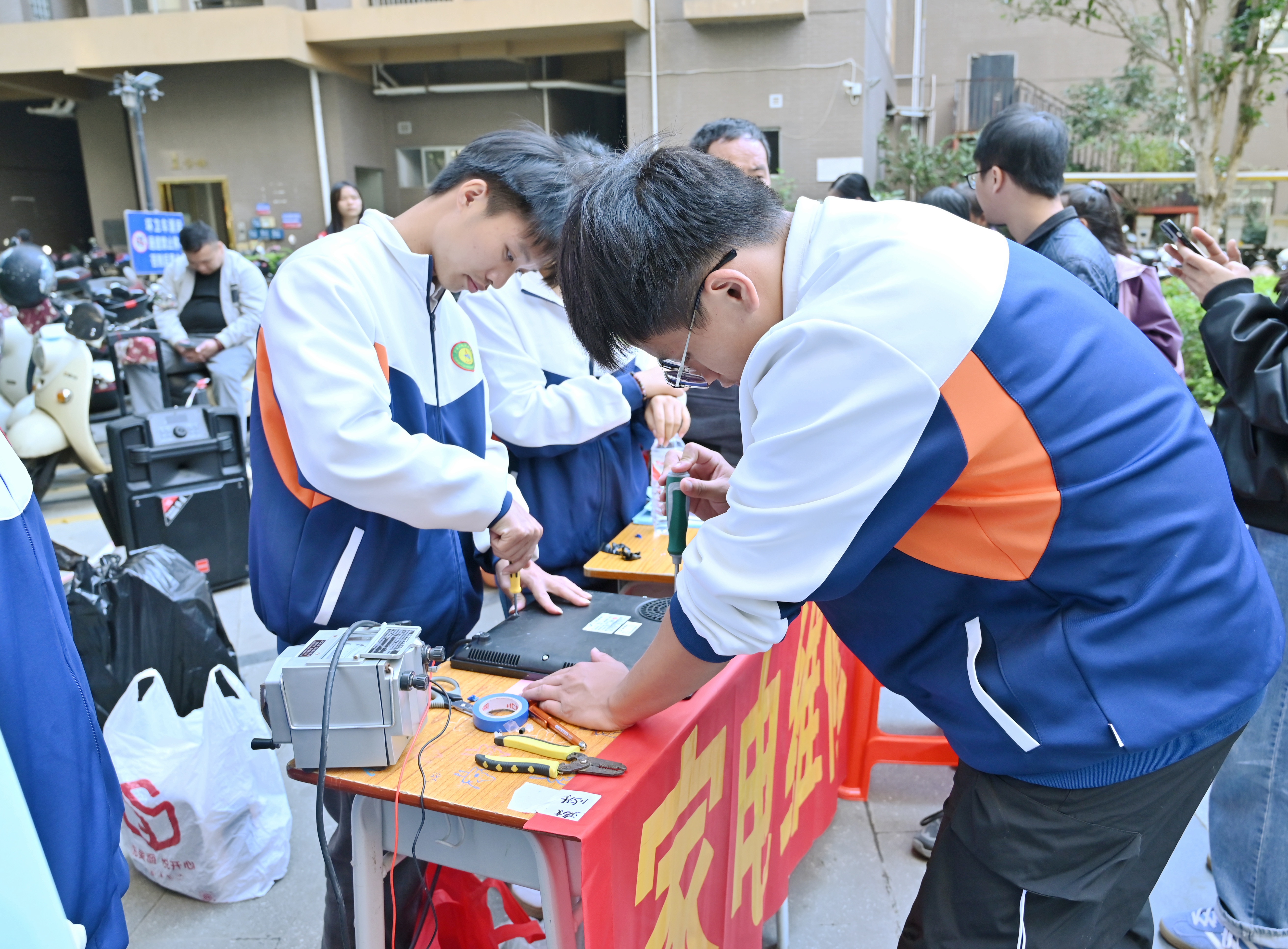 活動現(xiàn)場,師生黨員們攜帶專業(yè)工具,迅速搭建起臨時維修站,并擺放好各類維修工具,準(zhǔn)備為居民們的故障家電“把脈問診”。 居民們紛紛將家中出現(xiàn)故障的電水壺、電飯煲、電風(fēng)扇等小家電送來維修. 志愿者們分工明確,有的負(fù)責(zé)登記家電故障信息,有的仔細(xì)檢查家電、排查故障原因,還有的運用專業(yè)知識進(jìn)行精準(zhǔn)修復(fù). 遇到疑難故障時,大家便集體研討解決方案,展現(xiàn)出扎實的專業(yè)功底和團(tuán)結(jié)協(xié)作精神。