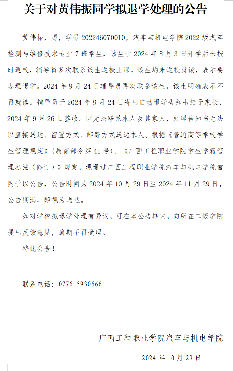 黃偉振,男,學(xué)號(hào)202246070010,汽車(chē)與機(jī)電學(xué)院2022級(jí)汽車(chē)檢測(cè)與維修技術(shù)專(zhuān)業(yè)7班學(xué)生,該生于2024年8月3日開(kāi)學(xué)后未按時(shí)返校,輔導(dǎo)員多次聯(lián)系該生返校上課,該生均未返校就讀,表示要辦理退學(xué)。2024年9月24日輔導(dǎo)員再次聯(lián)系該生,該生明確表示不再就讀。輔導(dǎo)員于2024年9月24日寄出自動(dòng)退學(xué)告知書(shū)給予家長(zhǎng),2024年9月26日簽收。因無(wú)法聯(lián)系本人及其家人,處理告知書(shū)無(wú)法以直接送達(dá)、留置方式、郵寄方式送達(dá)本人。根據(jù)《普通高等學(xué)校學(xué)生管理規(guī)定》(教育部令第41號(hào))、《廣西工程職業(yè)學(xué)院學(xué)生學(xué)籍管理辦法(修訂)》規(guī)定,現(xiàn)通過(guò)廣西工程職業(yè)學(xué)院汽車(chē)與機(jī)電學(xué)院官網(wǎng)予以公告,公告時(shí)間為2024年10月29日至2024年10月29日,公告期滿,即視為送達(dá)。