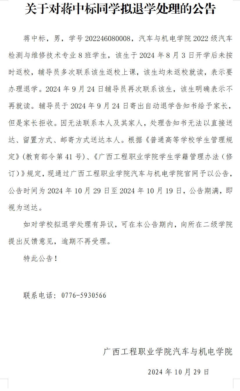 蔣中標,男,學(xué)號202246080008,汽車與機電學(xué)院2022級汽車檢測與維修技術(shù)專業(yè)8班學(xué)生,該生于2024年8月3日開學(xué)后未按時返校,輔導(dǎo)員多次聯(lián)系該生返校上課,該生均未返校就讀,表示要辦理退學(xué)。2024年9月24日輔導(dǎo)員再次聯(lián)系該生,該生明確表示不再就讀。輔導(dǎo)員于2024年9月24日寄出自動退學(xué)告知書給予家長,但是家長拒收。因無法聯(lián)系本人及其家人,處理告知書無法以直接送達、留置方式、郵寄方式送達本人。根據(jù)《普通高等學(xué)校學(xué)生管理規(guī)定》(教育部令第41號)、《廣西工程職業(yè)學(xué)院學(xué)生學(xué)籍管理辦法(修訂)》規(guī)定,現(xiàn)通過廣西工程職業(yè)學(xué)院汽車與機電學(xué)院官網(wǎng)予以公告,公告時間為2024年10月29日至2024年11月29日,公告期滿,即視為送達。