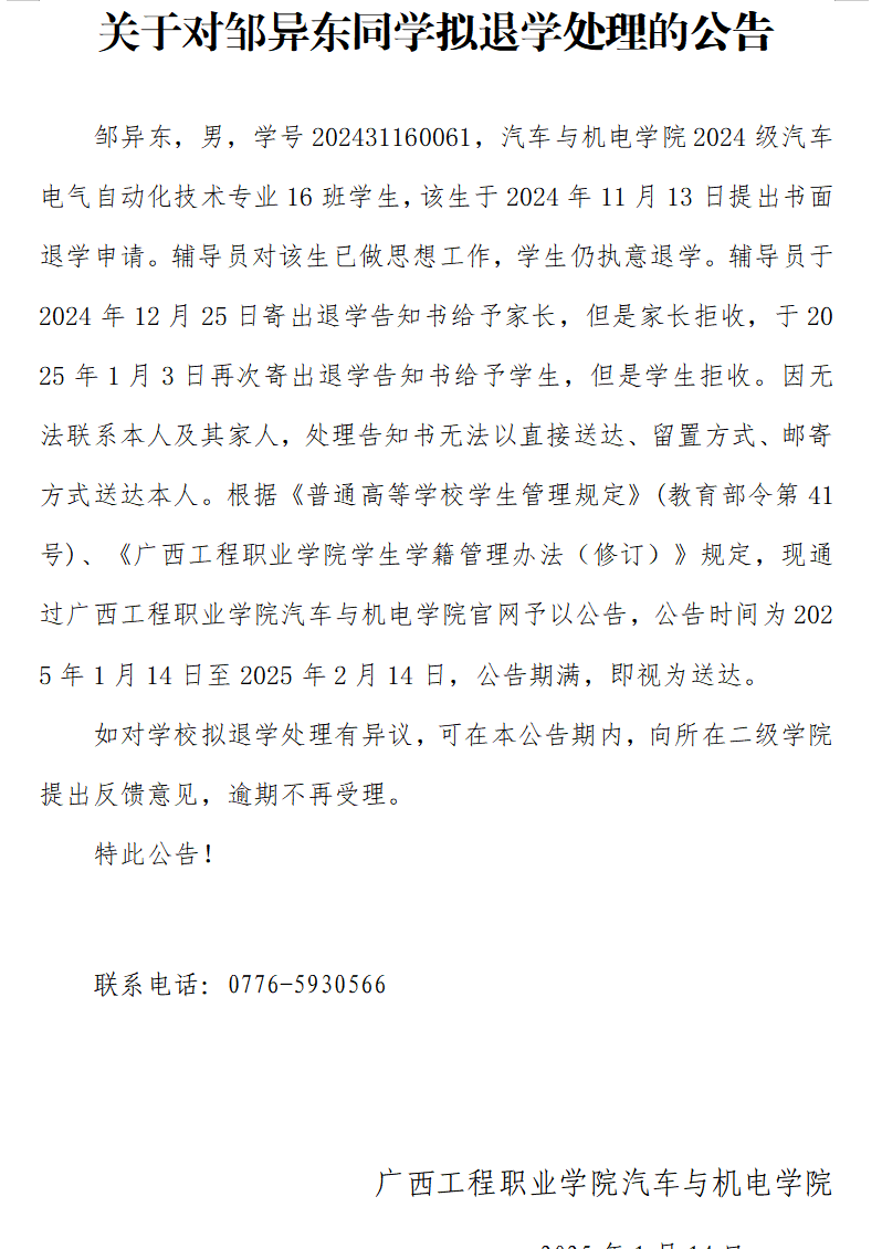 鄒異東,男,學(xué)號(hào)202431160061,汽車與機(jī)電學(xué)院2024級(jí)汽車電氣自動(dòng)化技術(shù)專業(yè)16班學(xué)生,該生于2024年11月13日提出書面退學(xué)申請(qǐng)。輔導(dǎo)員對(duì)該生已做思想工作,學(xué)生仍執(zhí)意退學(xué)。輔導(dǎo)員于2024年12月25日寄出退學(xué)告知書給予家長(zhǎng),但是家長(zhǎng)拒收,于2025年1月3日再次寄出退學(xué)告知書給予學(xué)生,但是學(xué)生拒收。因無法聯(lián)系本人及其家人,處理告知書無法以直接送達(dá)、留置方式、郵寄方式送達(dá)本人。根據(jù)《普通高等學(xué)校學(xué)生管理規(guī)定》(教育部令第41號(hào))、《廣西工程職業(yè)學(xué)院學(xué)生學(xué)籍管理辦法(修訂)》規(guī)定,現(xiàn)通過廣西工程職業(yè)學(xué)院汽車與機(jī)電學(xué)院官網(wǎng)予以公告,公告時(shí)間為2025年1月14日至2025年2月14日,公告期滿,即視為送達(dá)。