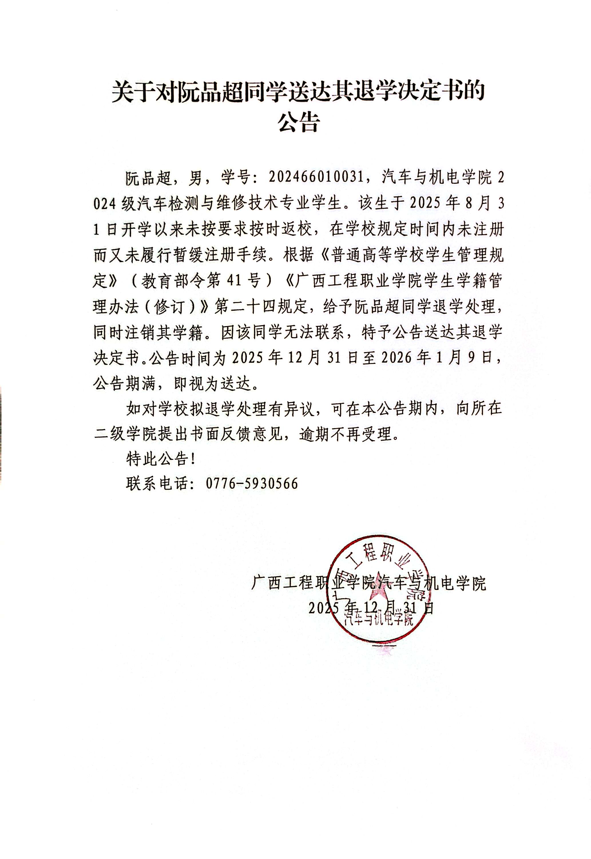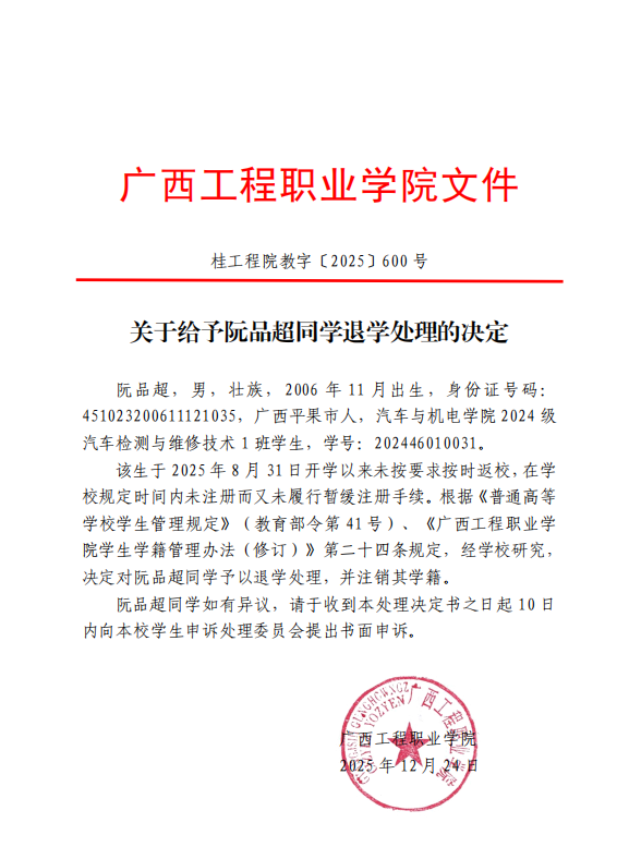 上一篇:關(guān)于對阮品超同學擬退學處理的公告