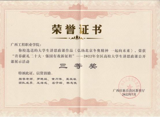 2022年全區(qū)高校大學(xué)生講思政課公開課展示活動(dòng)三等獎(jiǎng)榮譽(yù)證書