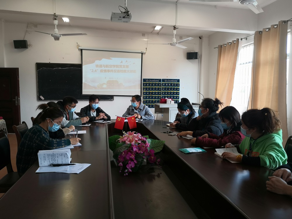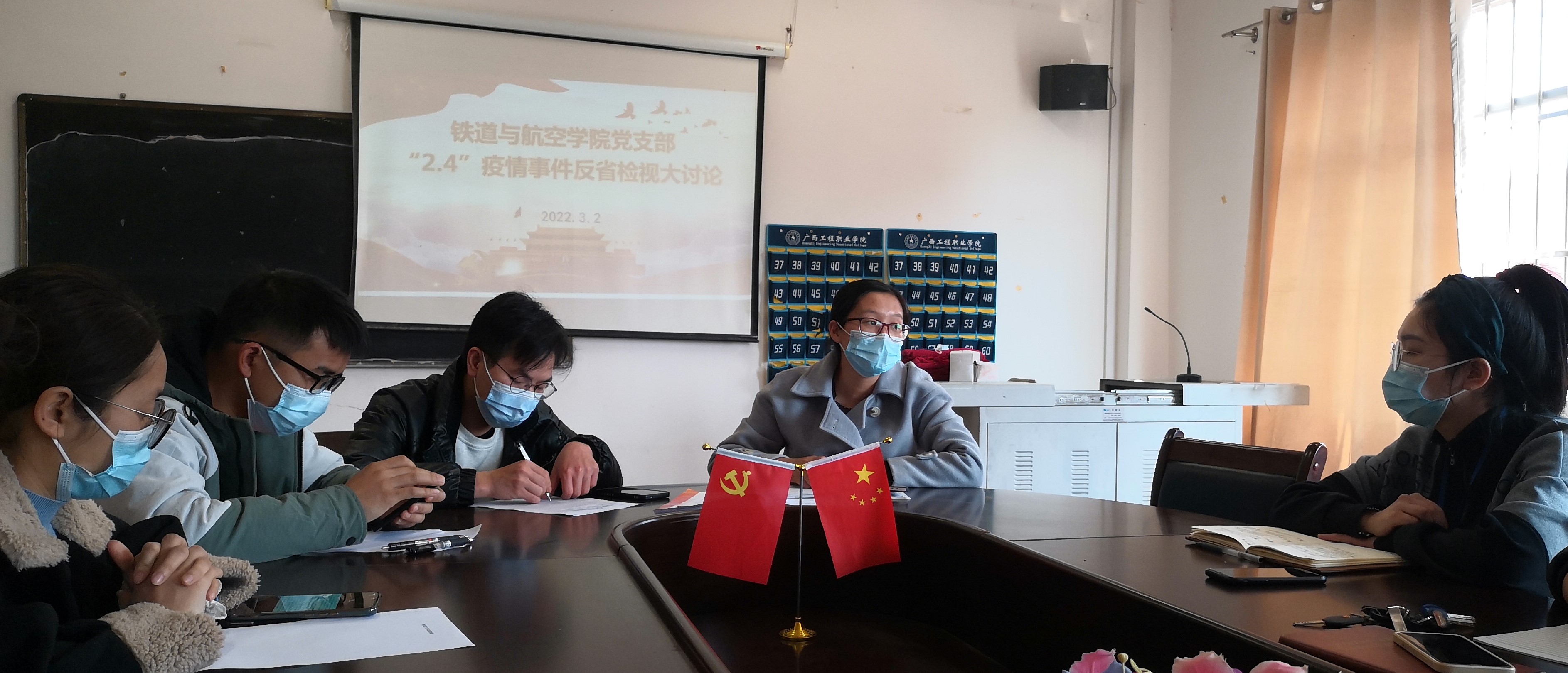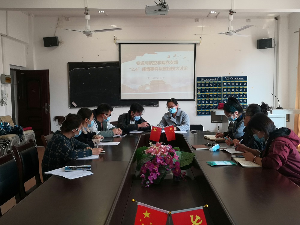 鐵道與航空學(xué)院黨支部根據(jù)《百色市委教育工委關(guān)于開展“2·4”疫情事件反省檢視大討論的通知》有關(guān)要求,結(jié)合本支部的實際情況,于3月2日下午以黨支部大會的形式在鐵道304開展了“2·4”疫情事件反省檢視大討論活動,鐵道與航空學(xué)院黨支部部分黨員及教師代表參與此次活動。