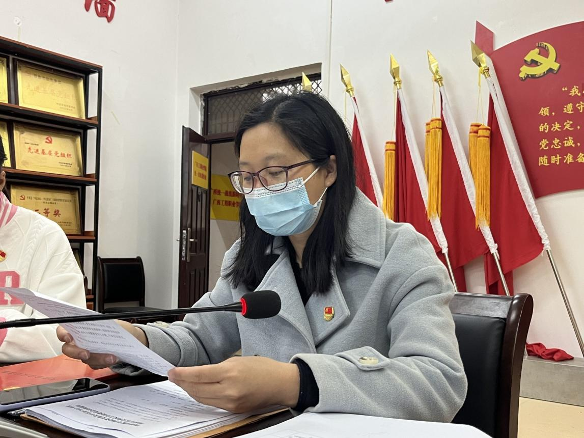 會(huì)上,學(xué)院黨支部書(shū)記覃鳳姣帶領(lǐng)支部黨員重點(diǎn)對(duì)黨的二十大精神、黨史黨章等內(nèi)容進(jìn)行了學(xué)習(xí),并匯報(bào)了2022年支部工作情況,查擺問(wèn)題情況以及整改措施,各黨員作出整改承諾,并明確了2023年工作計(jì)劃。隨后,各黨員聯(lián)系自己的思想認(rèn)識(shí)與生活實(shí)際,自我剖析工作生活中存在的優(yōu)缺點(diǎn),依次開(kāi)展批評(píng)和自我批評(píng)。并填寫(xiě)《黨員民主評(píng)議黨支部測(cè)評(píng)表》和《民主評(píng)議黨員測(cè)評(píng)表》。