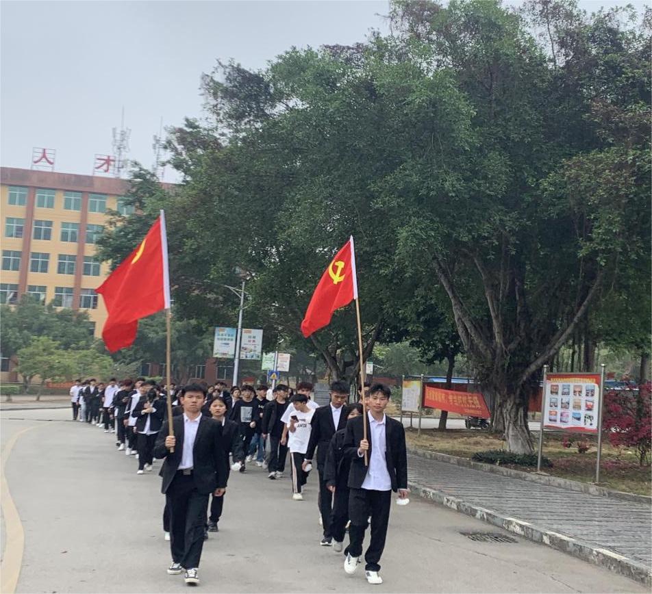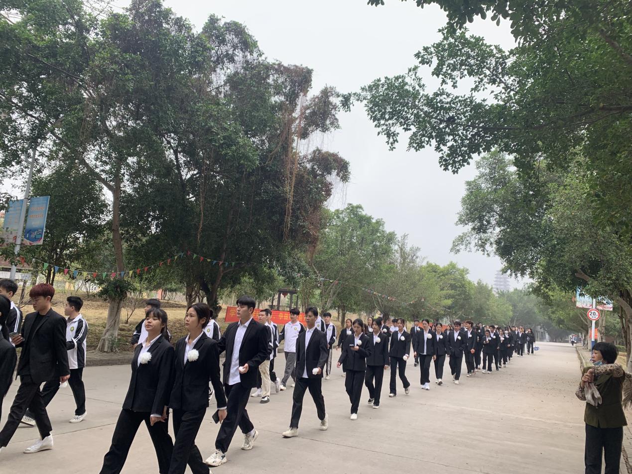 活動伊始,參加此次活動的全體成員手捧親手制作的小白花,排著整齊的隊伍,邁著堅定的步伐,一起從學校徒步去往平果市烈士陵園,體驗當年紅軍徒步二萬五千里的長征精神。