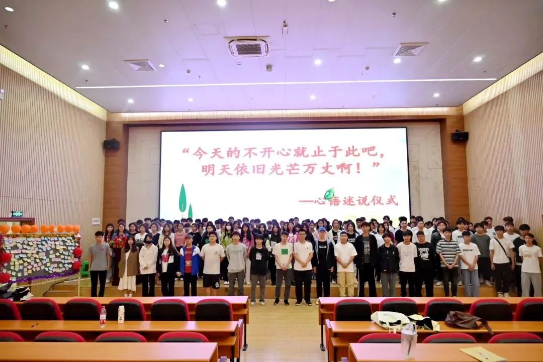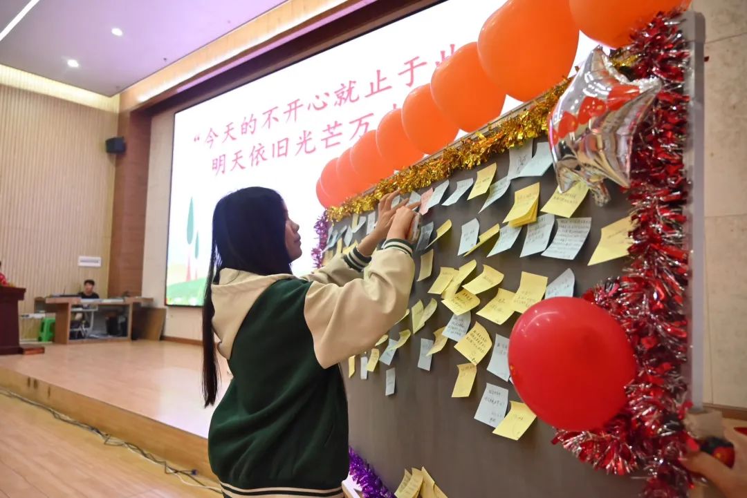 觀影結(jié)束后進(jìn)行了“今天的不開心就止于此吧,明天依舊光芒萬丈啊”心語述說儀式,工作人員給每個(gè)同學(xué)都發(fā)放一張便利貼,同學(xué)們?cè)诒憷N寫上近期不開心或者苦惱的事情,依次上臺(tái)貼在了展板上,以此告別煩惱。