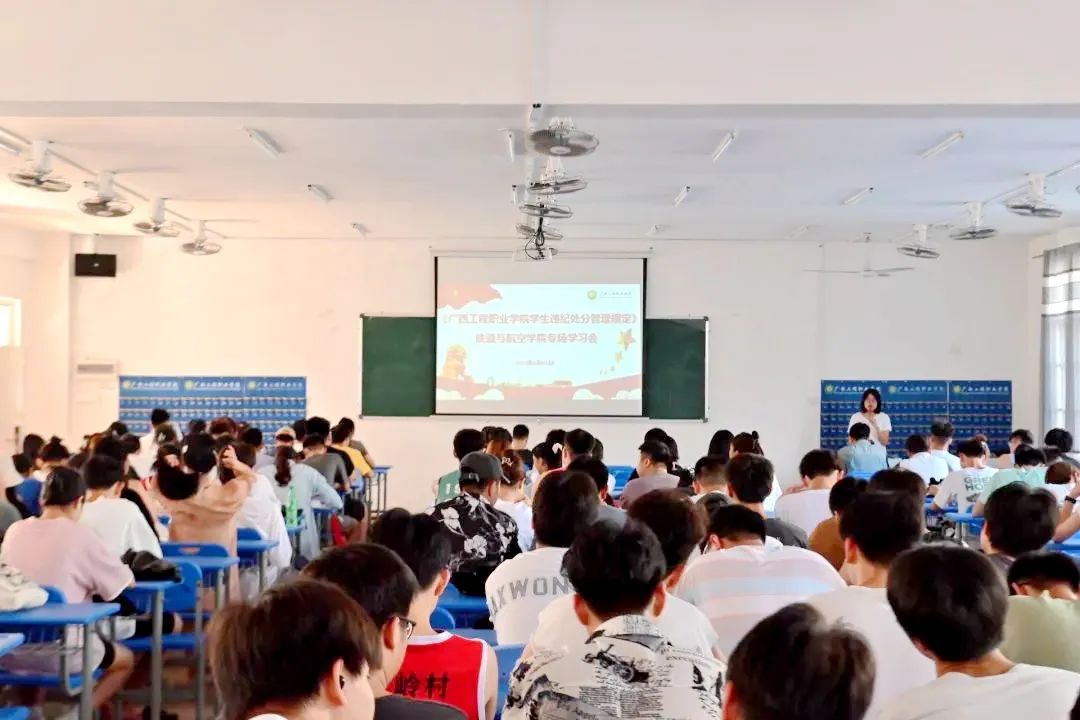 為進一步提高同學們的紀律意識,促進同學們更好地遵守校規(guī)校紀,規(guī)范言行舉止,遵紀守法,弘揚正氣,知行統(tǒng)一,教育和引導學生實行自我管理、自我服務、自我教育、自我監(jiān)督,6月11日下午,鐵道與航空學院在經(jīng)管樓102教室和202教室開展《廣西工程職業(yè)學院學生違紀處分管理規(guī)定》(修訂)主題教育學習會,學習會由鐵道與航空學院黨支部副書記宋蓉、分團委書記謝小玲主講,學院2021級、2022級全體學生參加此次學習。
