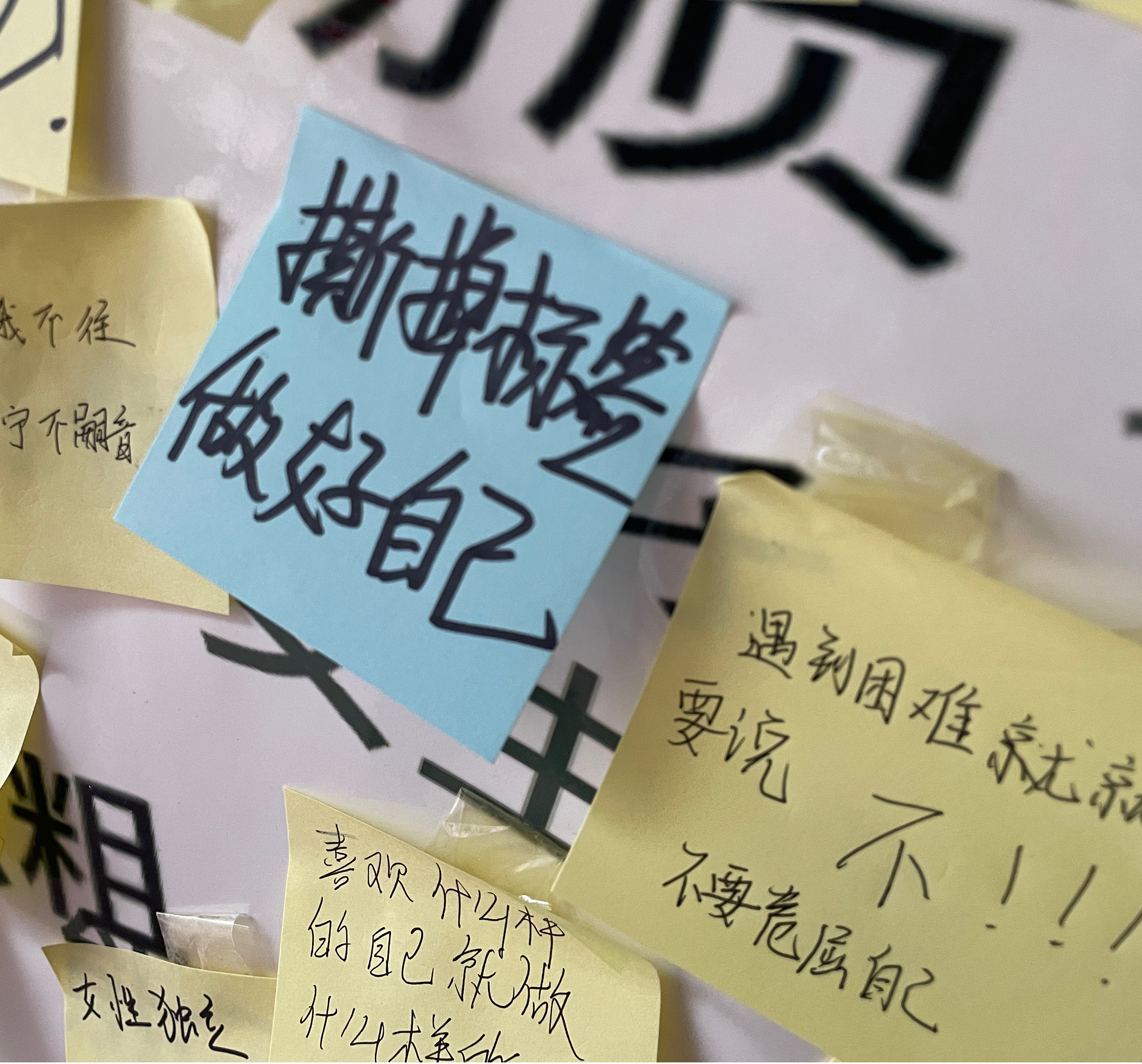 活動伊始,學生會成員先在展板上粘貼了女性的標簽,通過展板展示,讓學院女生撕下標簽,打破外界對女生的偏見、束縛和刻板印象,并且重新貼上給予自己及她人的祝福語。激勵大家解開束縛,自信地做自己?;顒舆^程中,吸引了學院眾多老師和同學們的關注,她們都表示此次活動新穎,極具意義。