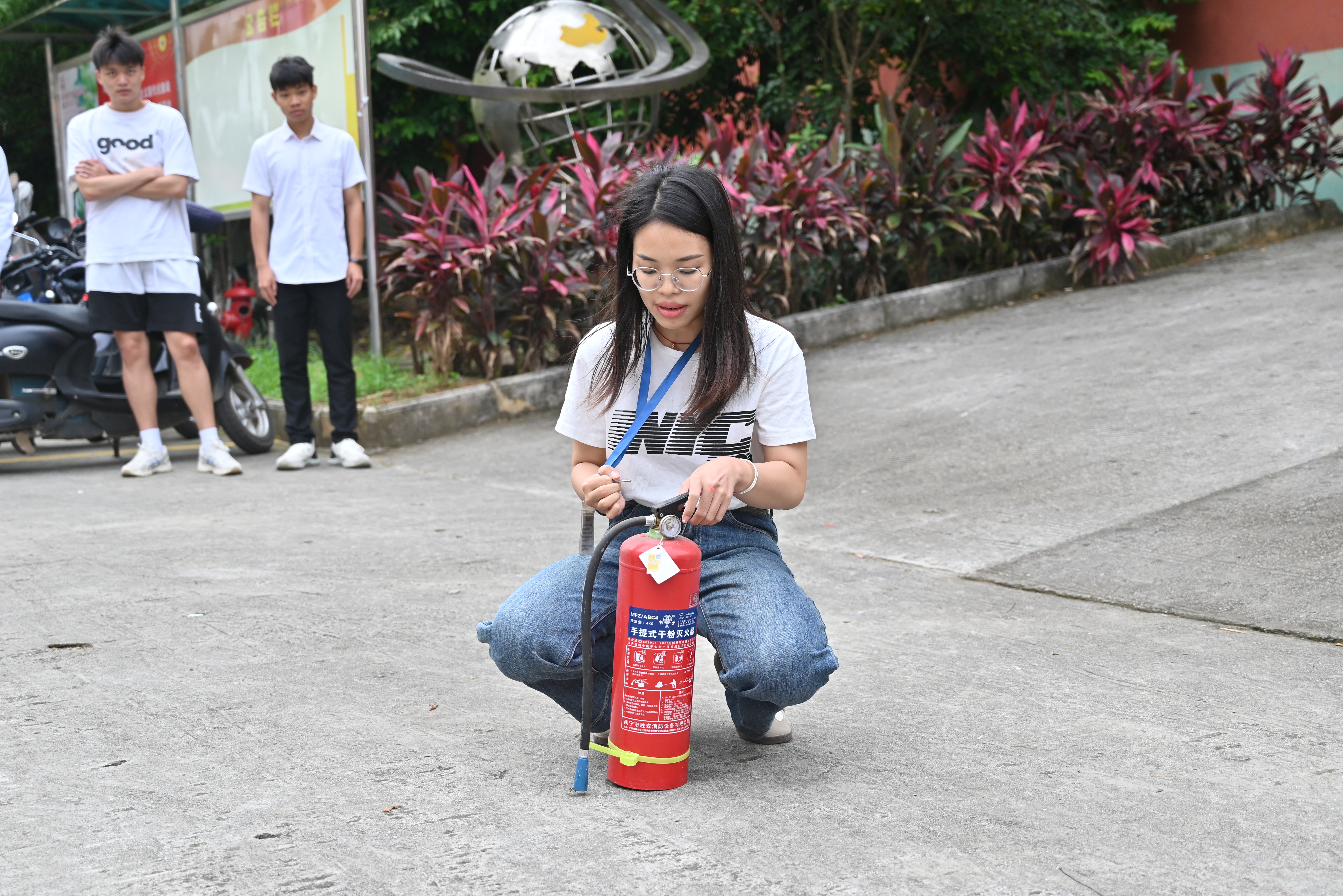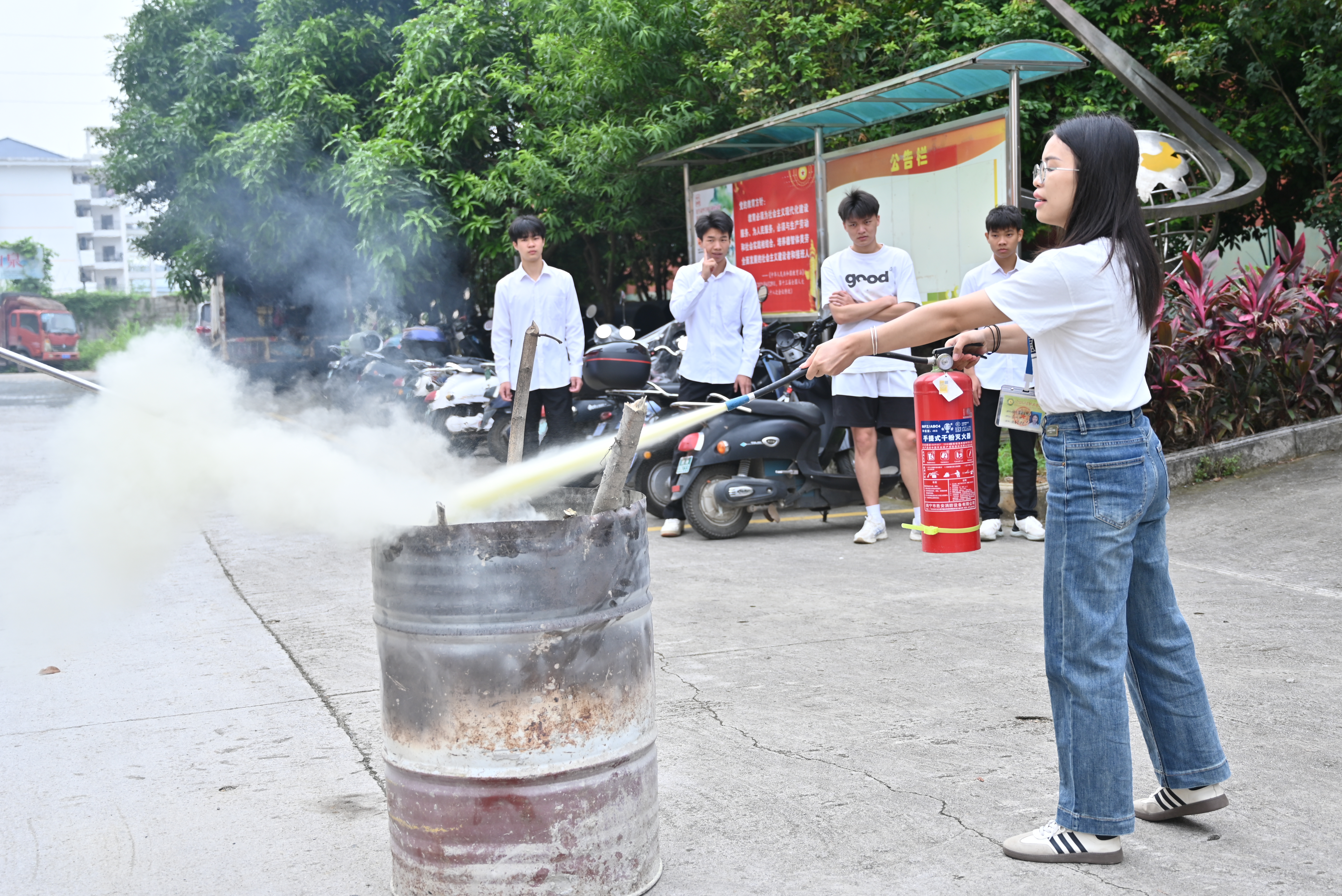 緊接的,韋麗妮老師現場給同學們介紹干粉滅火器的使用和注意事項,向同學們講解了干粉滅火器“一提二撥三瞄四壓”的操作方法并進行現場演示。