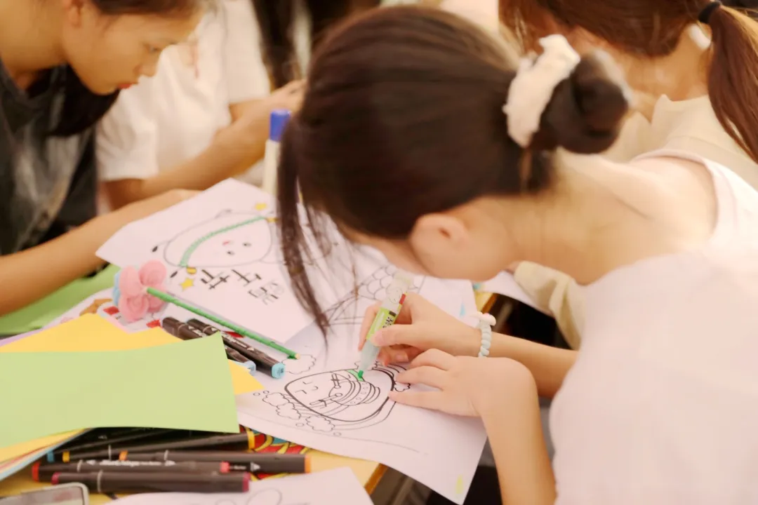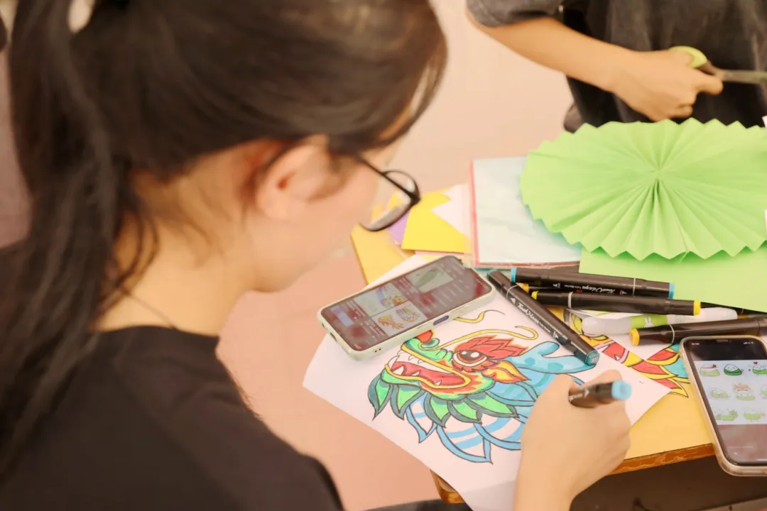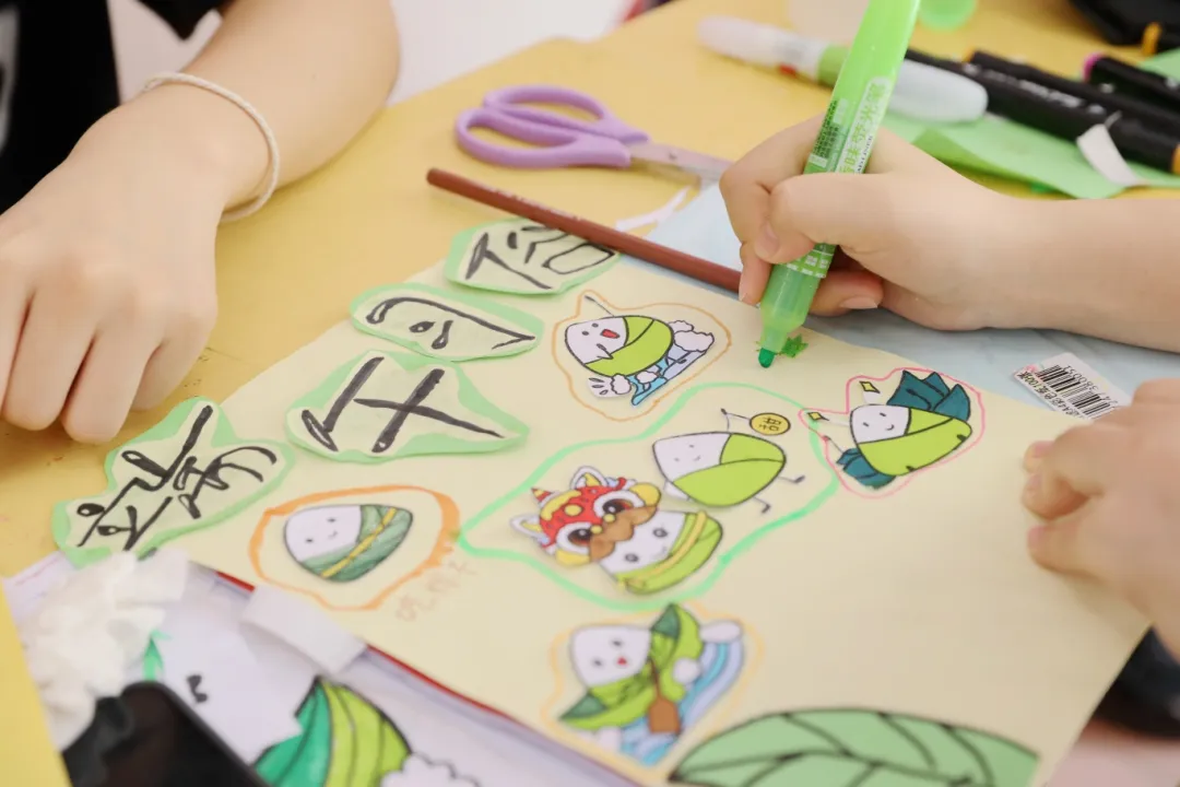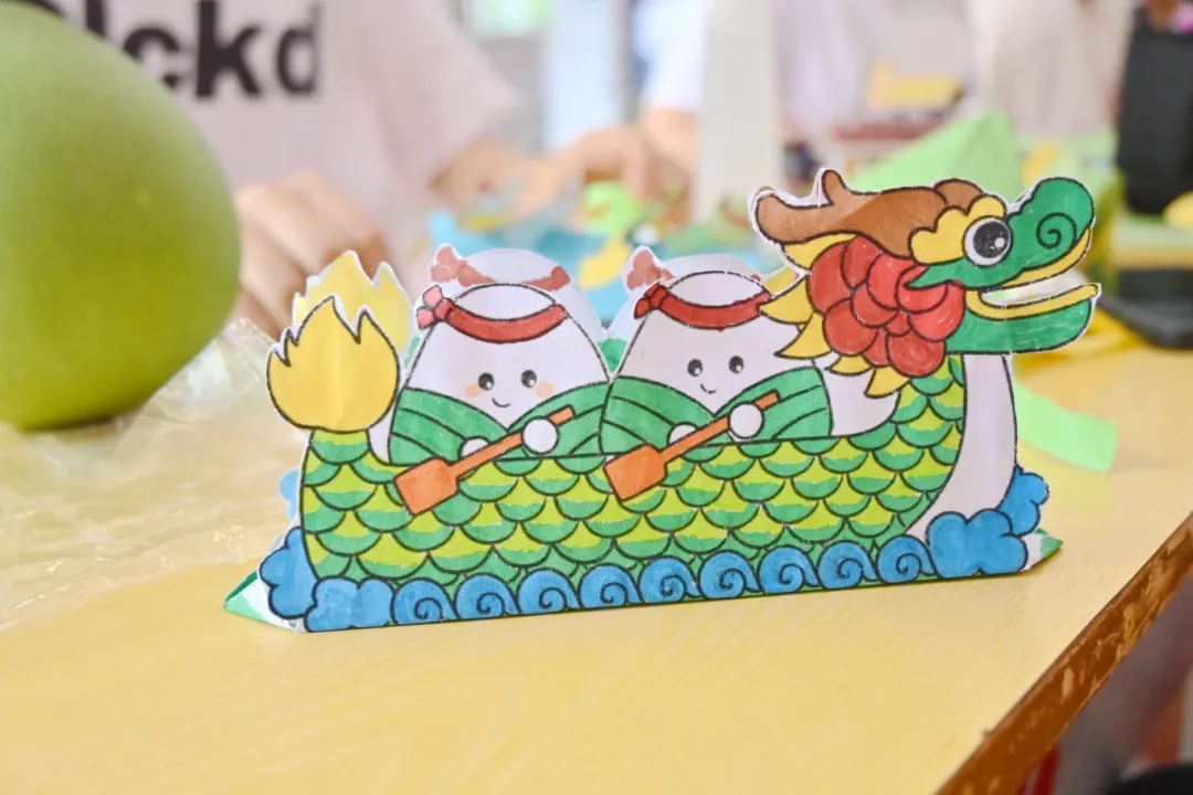 在活動(dòng)現(xiàn)場(chǎng)中,同學(xué)們以端午為主題,使用剪刀、彩紙、膠棒、畫筆等工具,通過(guò)折紙、剪紙、畫畫的方式制作出具備端午特色的手工藝品。