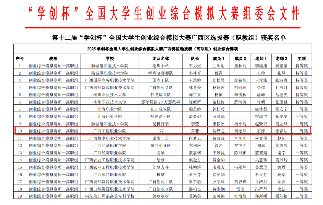 6月27日—28日,2025年第十二屆“學創(chuàng)杯”全國大學生創(chuàng)業(yè)綜合模擬大賽廣西賽區(qū)選拔賽(職教組)在柳州職業(yè)技術大學舉行,本次選拔賽(職教組)共有32所高校、500余師生參與競賽。我院徐琳、韋丹蕾兩位老師帶領2023級城市軌道交通工程技術專業(yè)方益元等同學參加了此次比賽,榮獲特等獎1項、一等獎1項、二等獎1項!