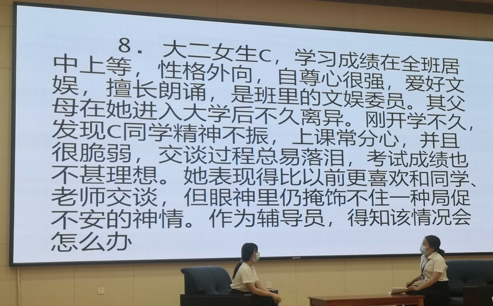 本屆大賽由學(xué)生工作處組織開展,大賽分為“基礎(chǔ)知識測試”、“談心談話”、“案例研討”三個環(huán)節(jié)。4月8日下午,進行“基礎(chǔ)知識測試”環(huán)節(jié),此環(huán)節(jié)采用閉卷作答方式進行,限時90分鐘,重點考察輔導(dǎo)員的理論素養(yǎng)和業(yè)務(wù)知識,全方位考核輔導(dǎo)員業(yè)務(wù)基本功。4月9日,分別進行“談心談話”、“案例研討”賽項。