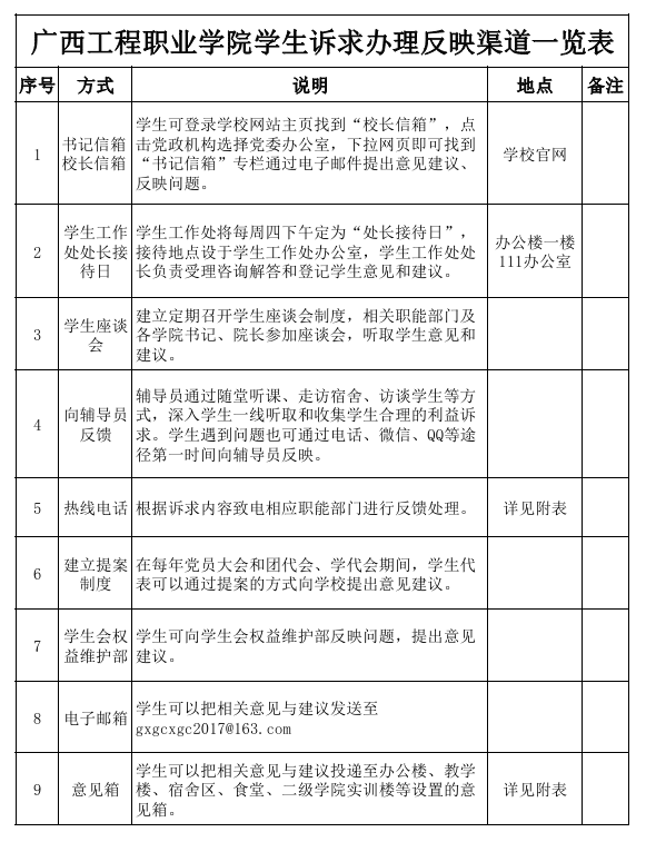 為切實保障學(xué)生訴求信息渠道暢通,切實解決學(xué)生反饋問題與訴求,經(jīng)研究,在校內(nèi)設(shè)立9個反饋渠道,主動對接、及時回應(yīng)學(xué)生相關(guān)訴求?,F(xiàn)將相關(guān)反饋渠道已通知如下:
