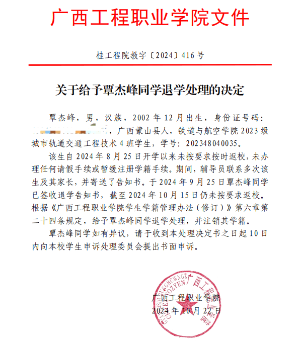 根據(jù)《普通高等學(xué)校學(xué)生管理規(guī)定》(教育部令第41號)、《廣西工程職業(yè)學(xué)院學(xué)生學(xué)籍管理辦法(修訂)》第二十四條規(guī)定,給予覃杰峰同學(xué)退學(xué)處理,并注銷其學(xué)籍。