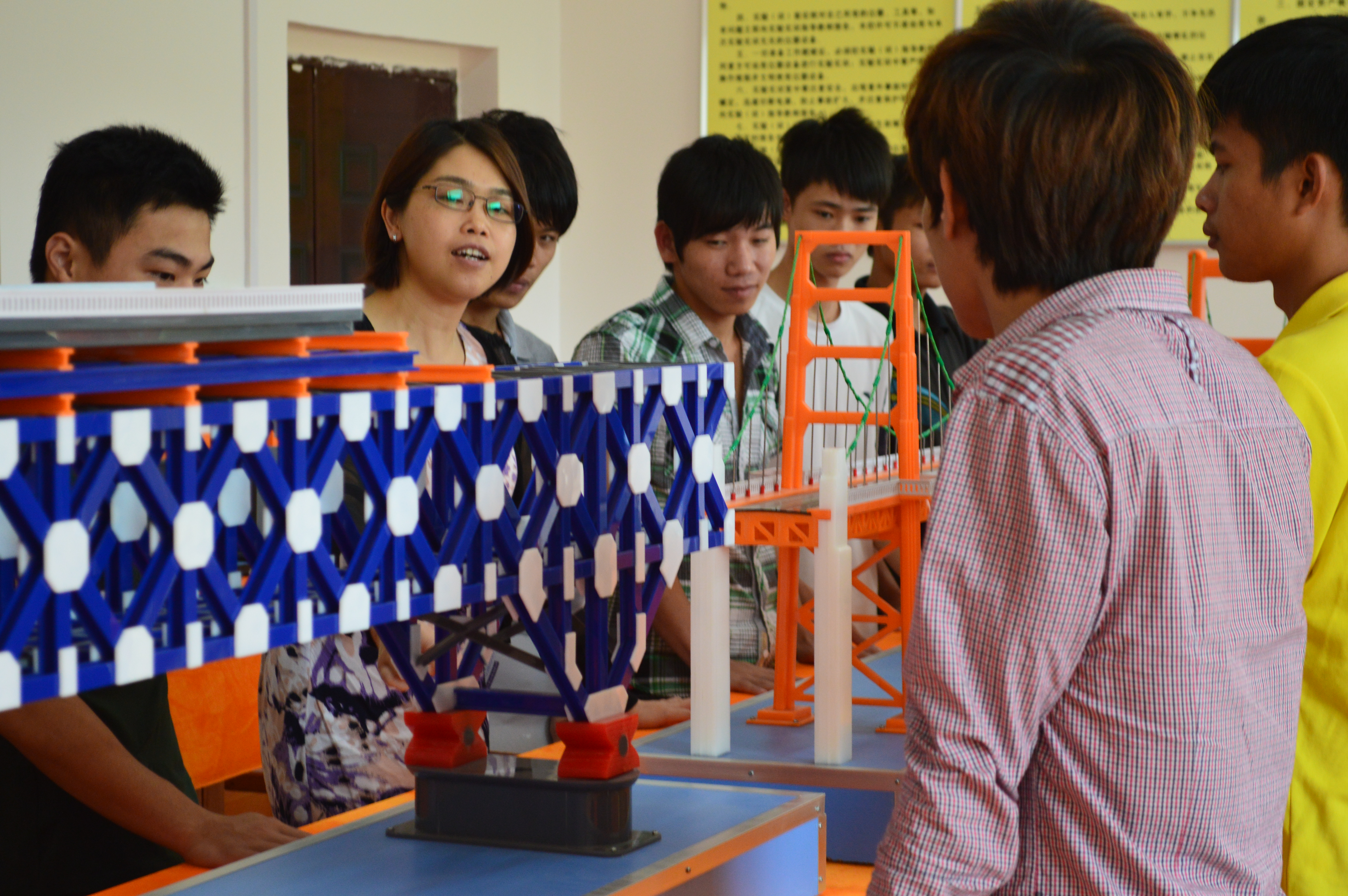 橋梁工程模型室2位于土木工程學(xué)院1號(hào)樓206室,面積約為70平方米,現(xiàn)有趙州橋、南京長(zhǎng)江大橋、裝配T形簡(jiǎn)支梁橋、預(yù)應(yīng)力混凝土組合箱梁橋一般構(gòu)造、重慶長(zhǎng)江公路大橋、江陰長(zhǎng)江大橋(懸索橋)、美國(guó)舊金山金門大橋、橋面鋪裝構(gòu)造(示教板)、橡膠伸縮縫(4種)、裝配式T型梁配筋、盆式橡膠支座、T形梁橋荷載橫發(fā)布實(shí)驗(yàn)?zāi)P停ㄓ袡M隔梁、無(wú)橫隔梁)、各類輕型橋墩(X、V、傾斜式、雙叉式、四叉式、T形等共6種)、樁柱式橋墩、肋形埋置式橋臺(tái)、耳墻式橋臺(tái)、沉井結(jié)構(gòu)、樁基礎(chǔ)等28臺(tái)套設(shè)備。主要面向道路橋梁工程技術(shù)專業(yè)開(kāi)設(shè)《路基路面》、《道橋施工圖識(shí)圖》、《公路工程組織設(shè)計(jì)》等觀摩課,可同時(shí)容納30名學(xué)生觀摩。