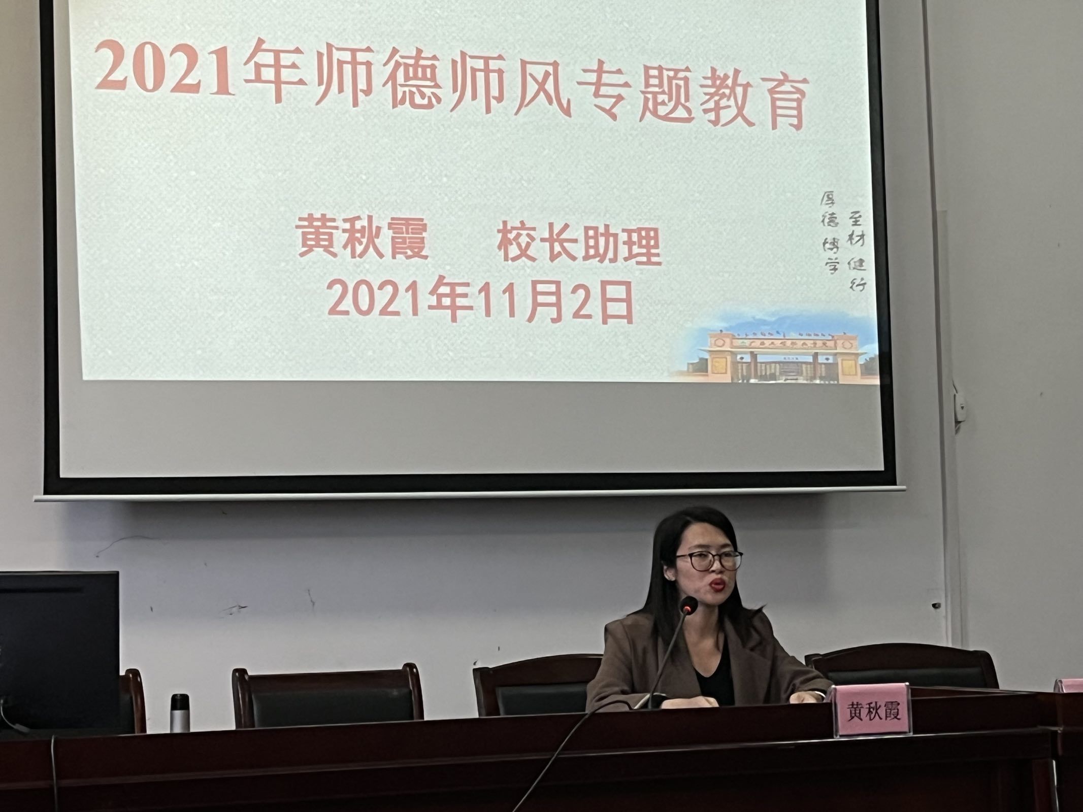 會上,校長助理黃秋霞作《師德師風(fēng)及工作要求》專題教育,主要從“四有好老師”、“四個引路人”、“四個相統(tǒng)一”三個內(nèi)容進(jìn)行闡述。黃助理指出,作為高校教師,我們要牢記為黨育人,為國育才的初心和使命,要堅持立德樹人的根本任務(wù),教書育人。爭做有理想信念、有道德情操、有扎實(shí)學(xué)識、有仁愛之心的“四有”好老師。同時還要爭做學(xué)生錘煉品格的引路人、做學(xué)生學(xué)習(xí)知識的引路人、做學(xué)生創(chuàng)新思維的引路人、做學(xué)生奉獻(xiàn)祖國的引路人的“四個引路人”;加強(qiáng)自身綜合素養(yǎng)的學(xué)習(xí),做到堅持教育和育人相統(tǒng)一、堅持言傳和身教相統(tǒng)一、堅持潛心問道和關(guān)注社會相統(tǒng)一、堅持學(xué)術(shù)自由和學(xué)術(shù)規(guī)范相統(tǒng)一的“四個相統(tǒng)一”。