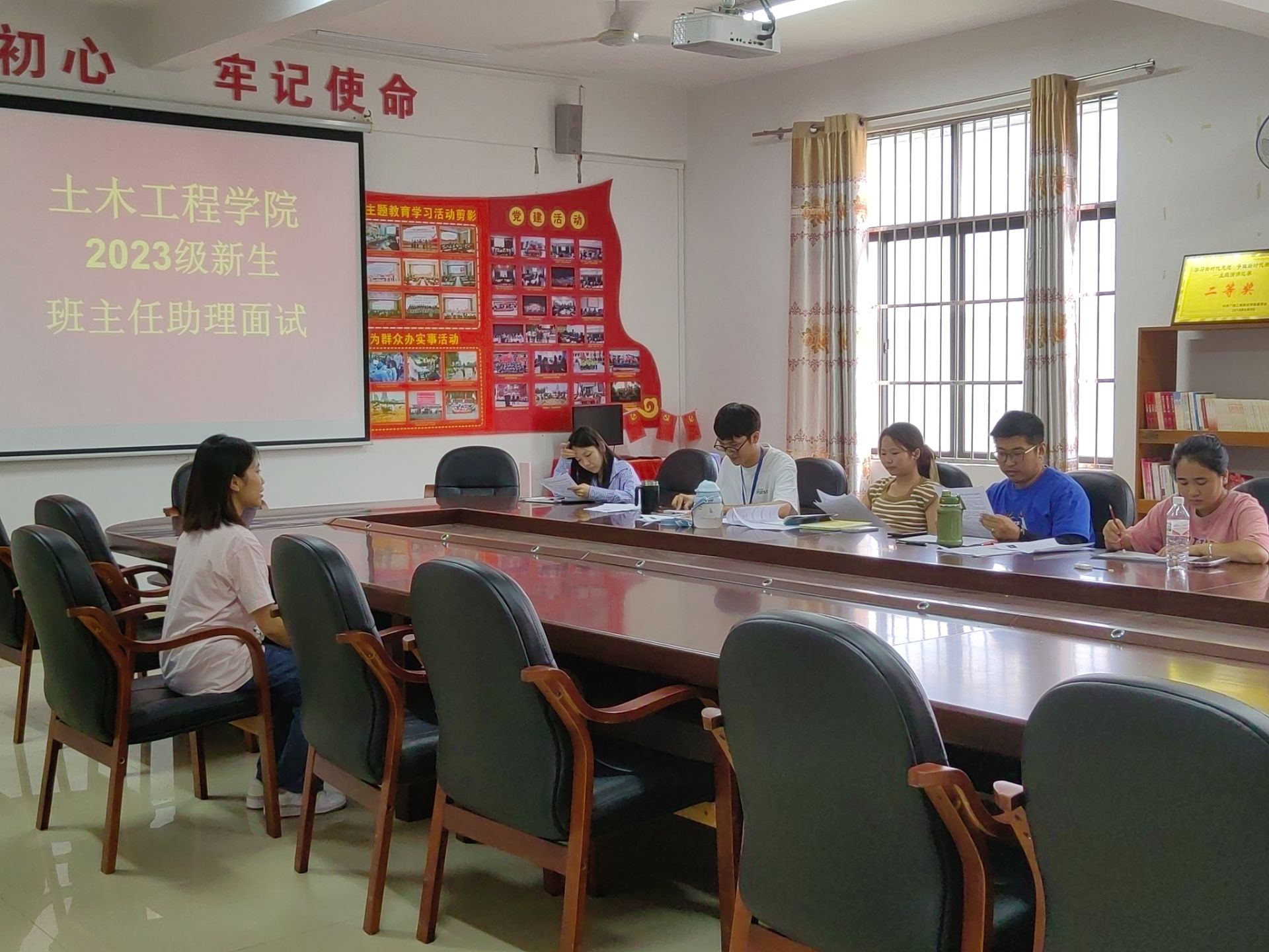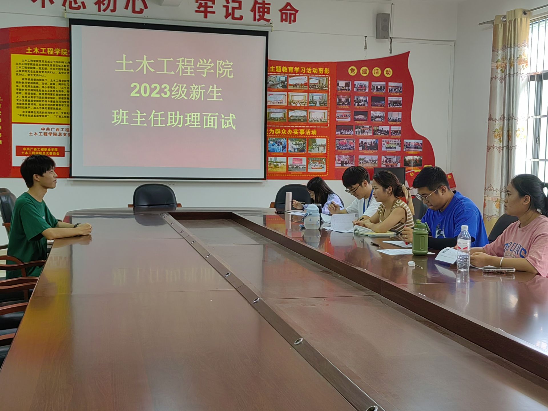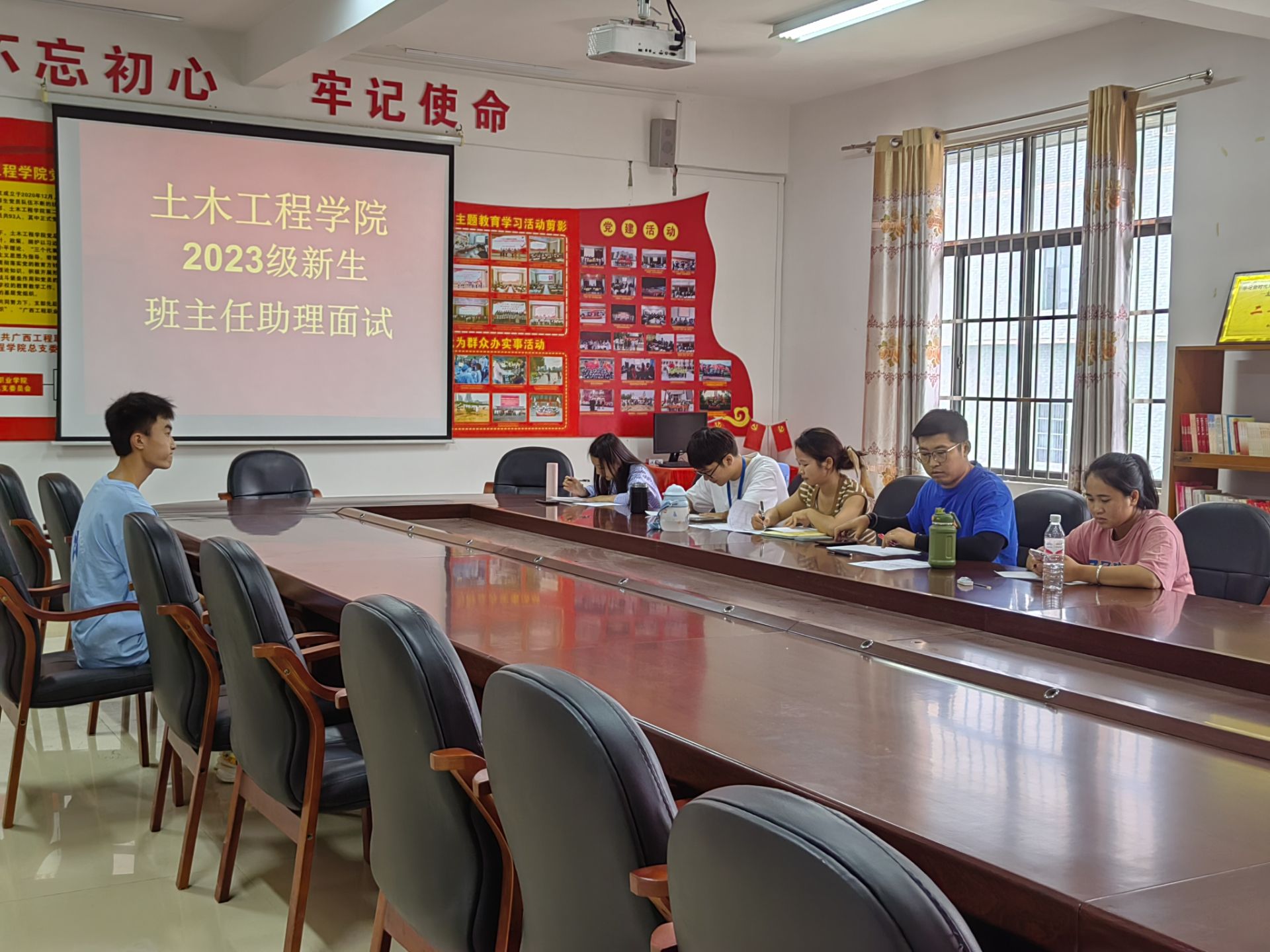 2023年8月29日下午16點30分,土木工程學院2023級新生輔導員助理選拔面試在土木工程學院301會議室舉行,共有40位同學參與面試,黃建博老師、陸明梅老師、覃家珍老師、雷其致老師、余慧婷老師擔任面試評委。