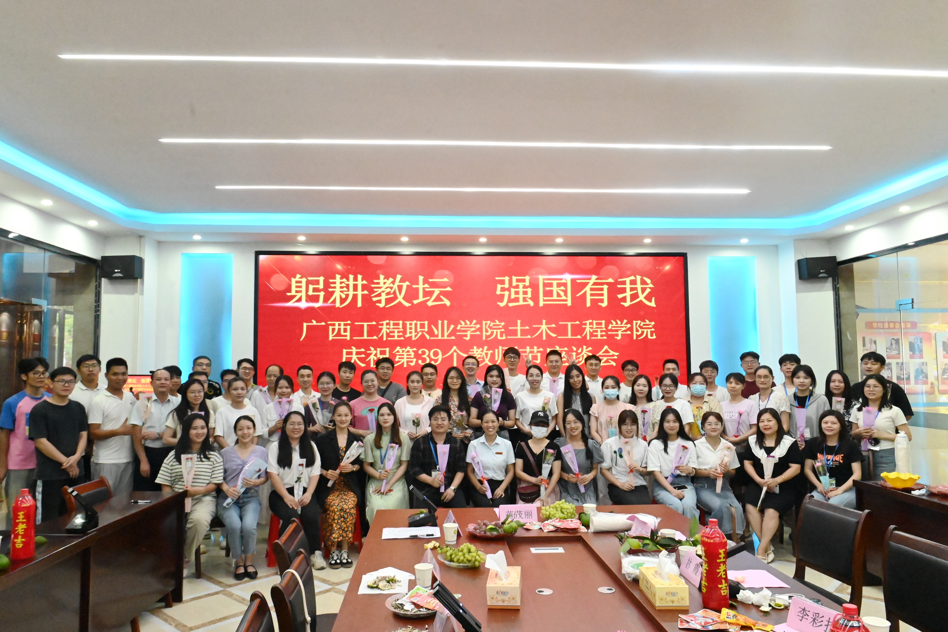 為慶祝第39個教師節(jié)到來,營造尊師重教的良好氛圍,提升教師的幸福感、成就感、榮譽感,激勵廣大教師積極投身學(xué)校建設(shè)實踐,9月10日下午16點,土木工程學(xué)院在圖書館大數(shù)據(jù)中心會議室召開主題為“躬耕教壇,強國有我”教師節(jié)座談會。廣西工程職業(yè)學(xué)院副校長蔣茂麗出席,由土木工程學(xué)院副院長楊竟主持,土木工程學(xué)院、人力資源處、財務(wù)處全體教師參加本次座談會。