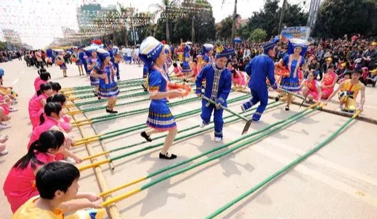 三月三除了有令人難忘的美食之外,還有許多有意義的民族特色活動,比如跳竹竿舞、山歌對唱等。山歌對唱是男女青年聚集在歌圩點進(jìn)行對唱,男青年主動唱“游覽歌”邀歌,姑娘有意便合歌而唱交情歌,趁旁人不注意悄悄將繡球贈與意中人。竹竿舞則是由持著竹竿的人來回滑動碰擊,舞者在兩桿滑動相碰的空隙跳動,她們模仿著螞蟻、斑鳩、豹子、畫眉等動物舞蹈形態(tài)優(yōu)美、活潑歡快。