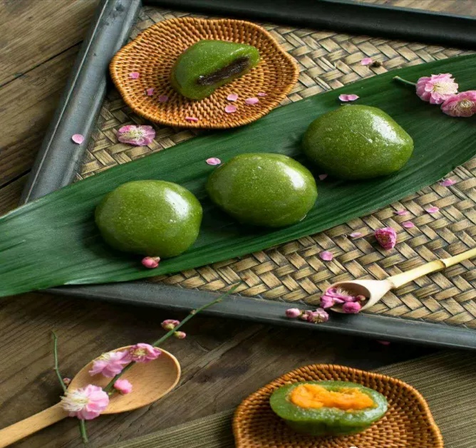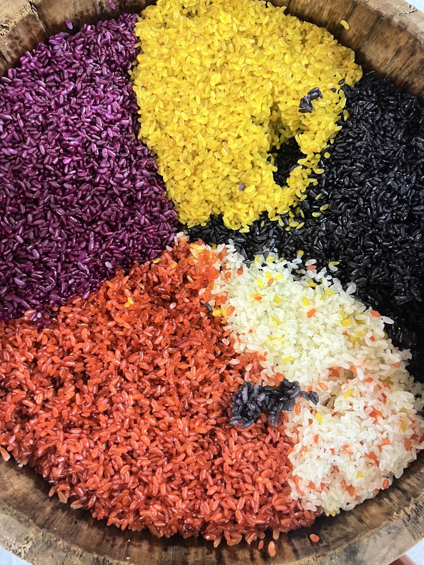 壯鄉(xiāng)三月三來臨之際家家戶戶都會提前準(zhǔn)備好紅蘭草花、紅楓葉、紫番藤、黃飯花浸泡制成紅、黃、黑、紫、白五色糯米,五色糯米不僅象征著五谷豐登、幸福吉祥,還有具有驅(qū)寒避邪的功效。除了好吃的五色糯米飯還有清香美味的艾草青團(tuán),它是由精選新鮮艾草制作而成,吃青團(tuán)不僅是為了懷念祖先、紀(jì)念先人