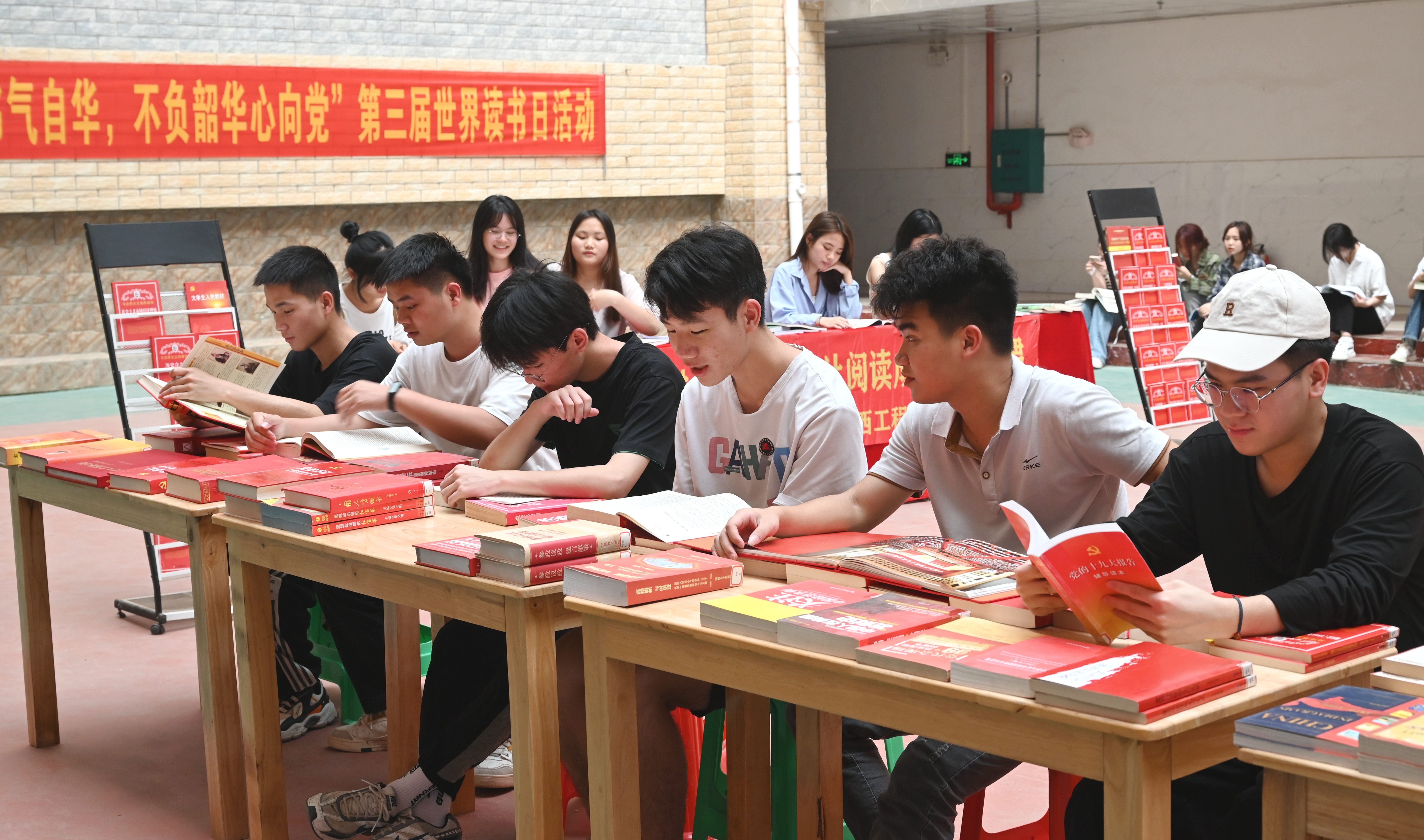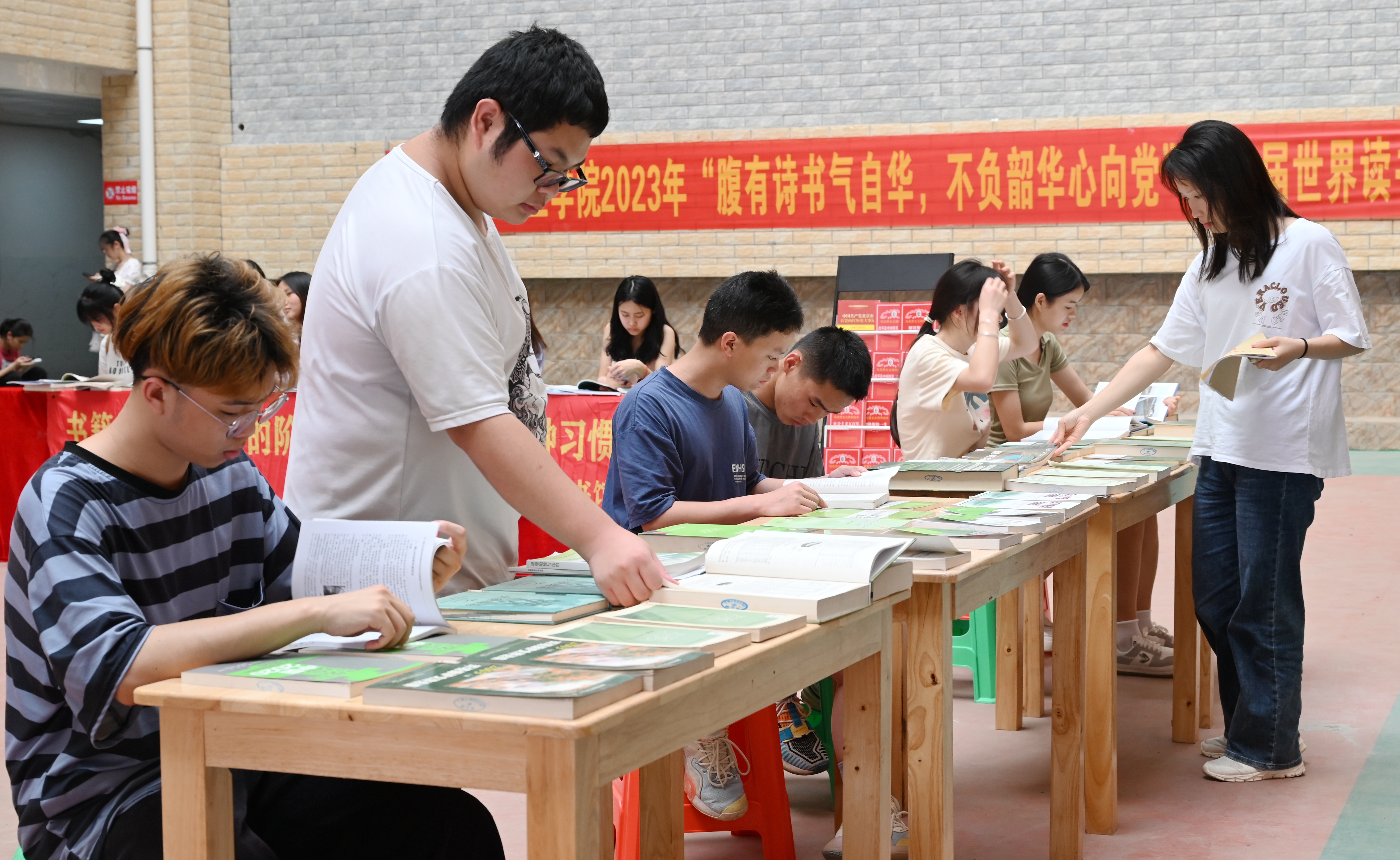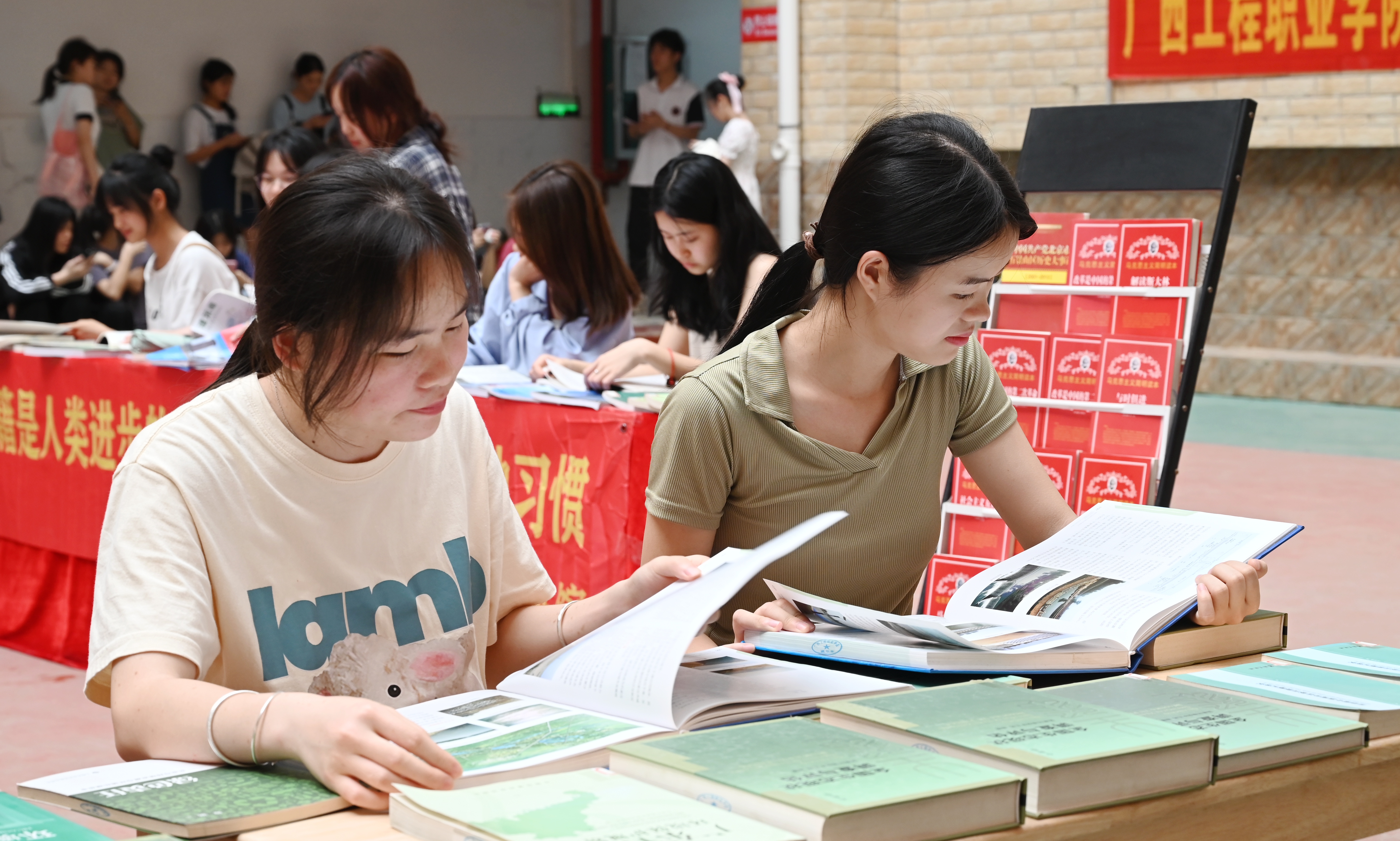 在圖文信息大樓一樓大廳出展紅色讀物、經(jīng)典文學(xué)作品、生態(tài)文明類書刊等,同學(xué)們在靜心閱讀,徜徉書海,品味書香。