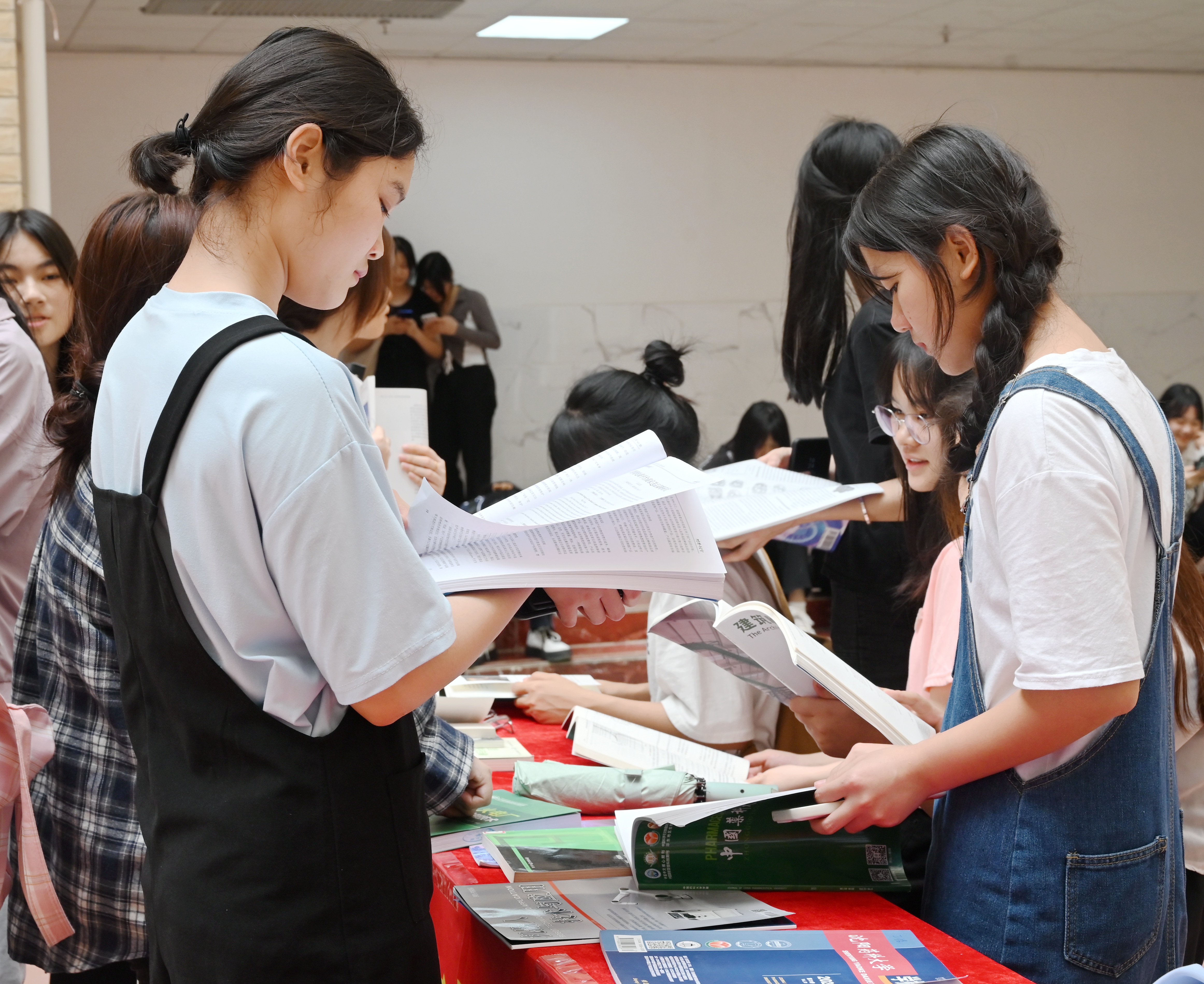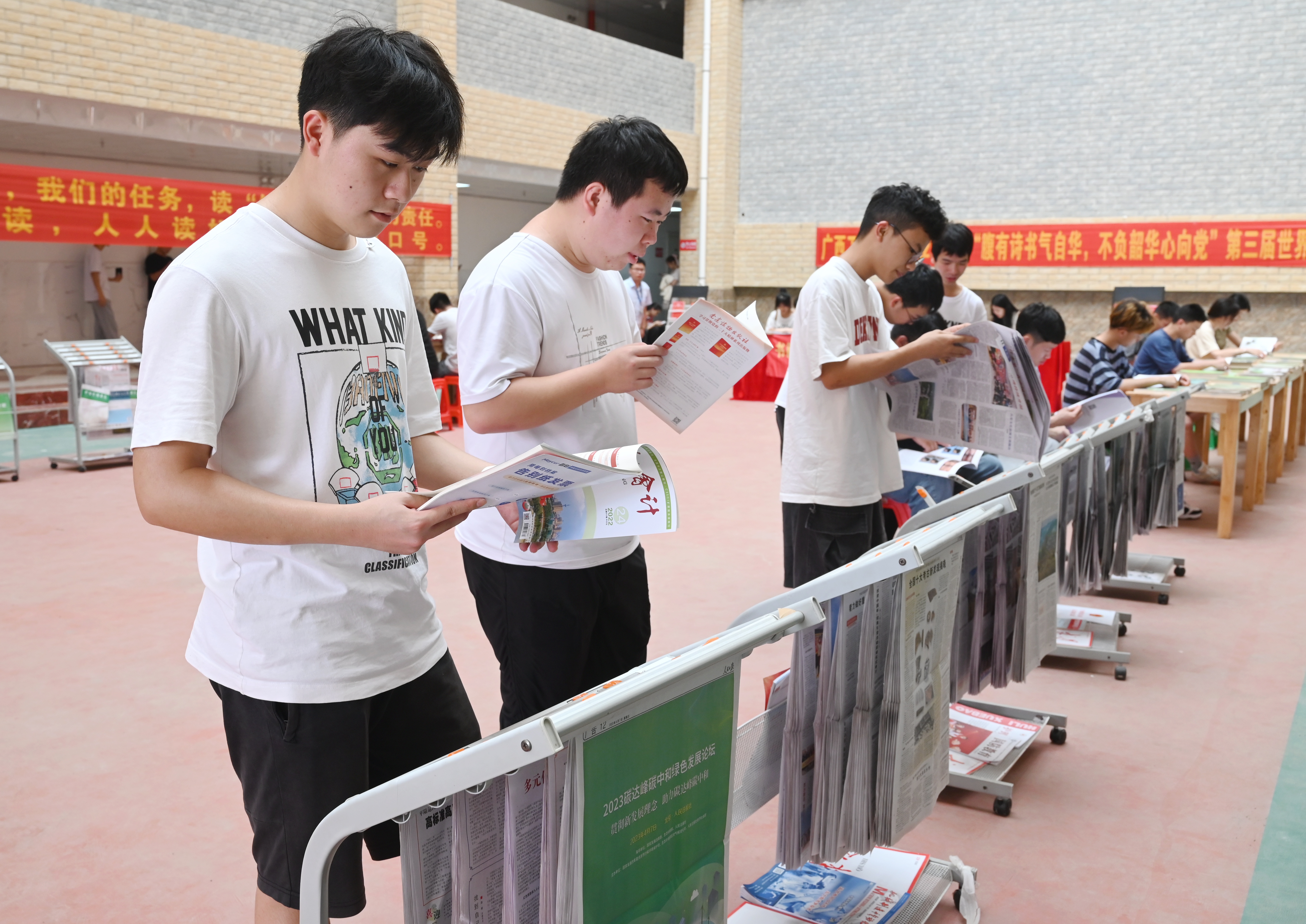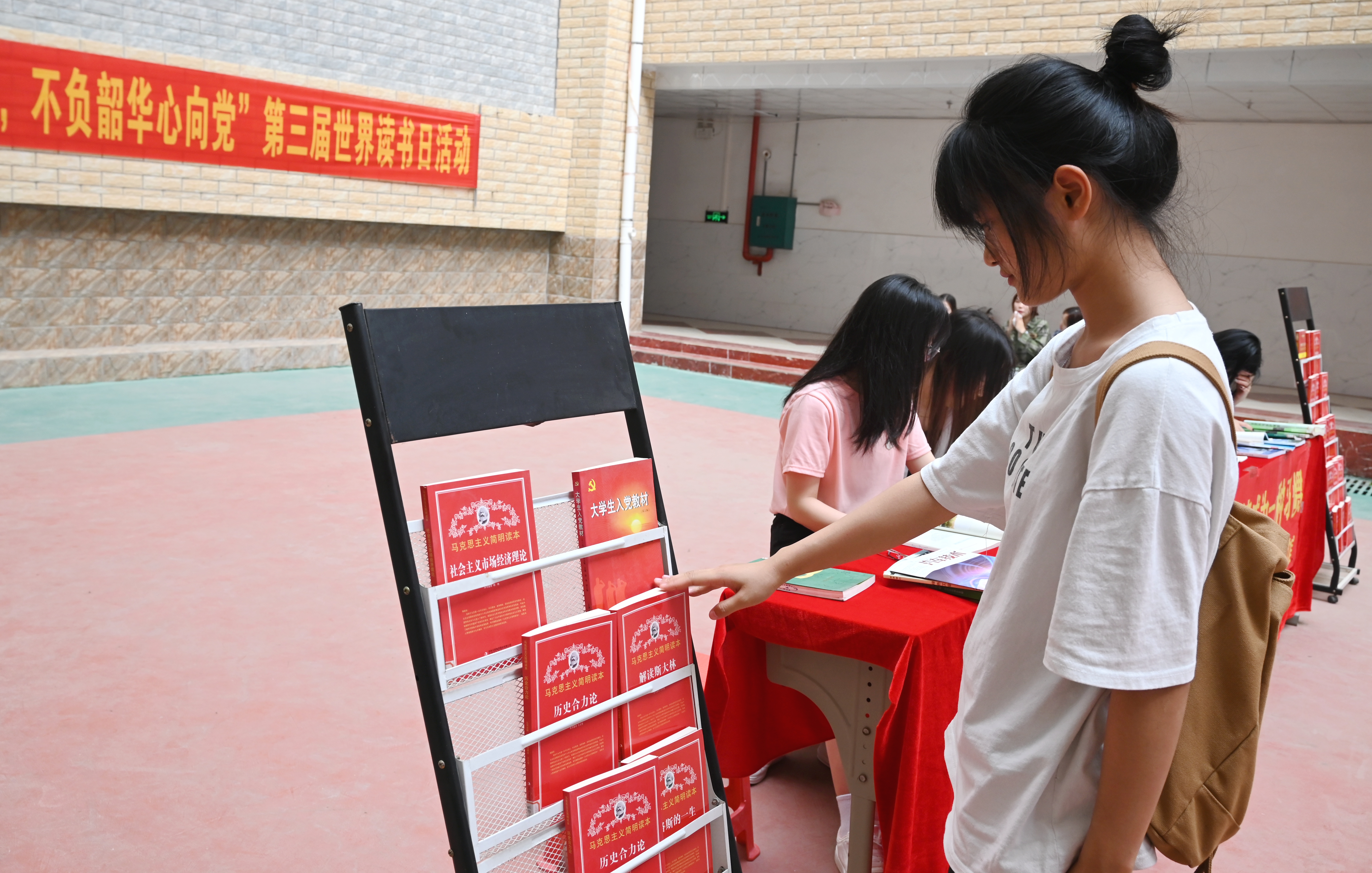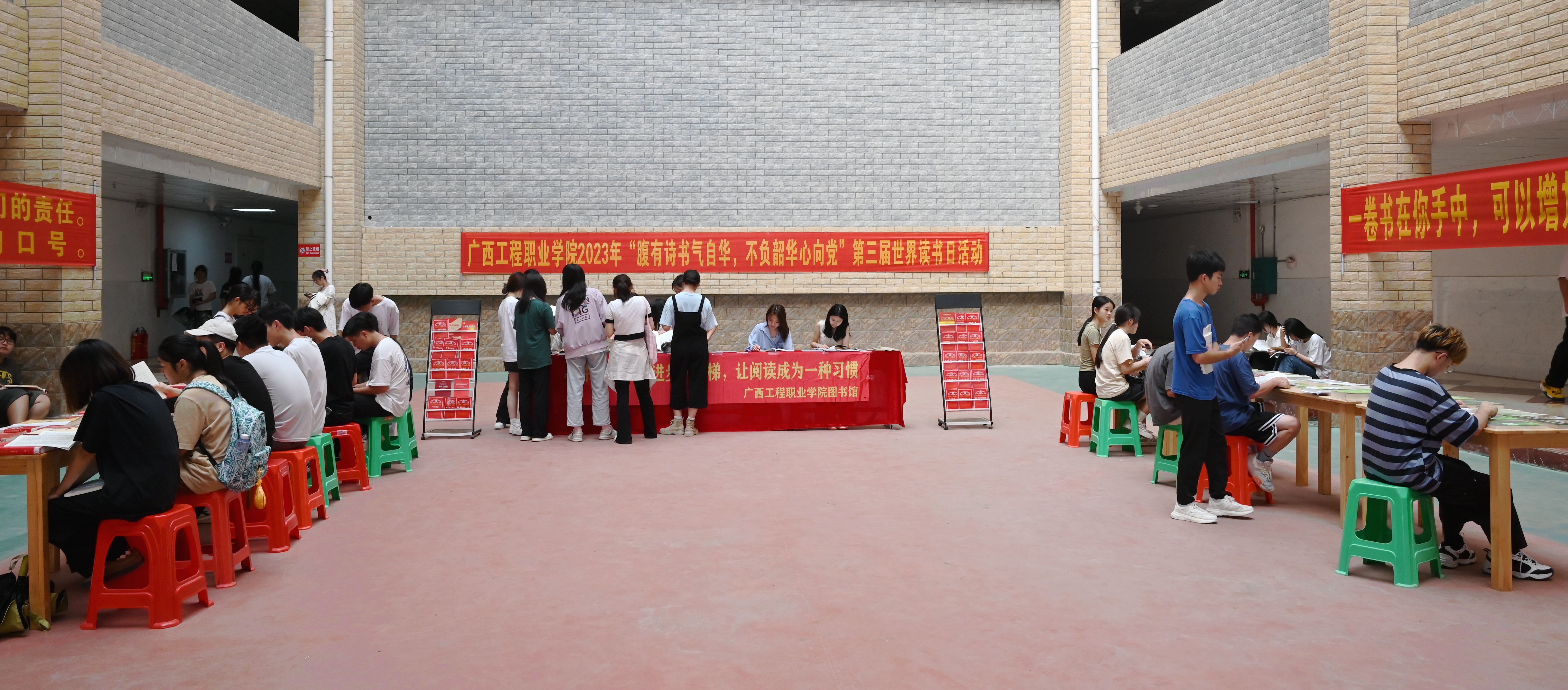 在圖文信息大樓一樓大廳出展紅色讀物、經(jīng)典文學(xué)作品、生態(tài)文明類書刊等,同學(xué)們在靜心閱讀,徜徉書海,品味書香。
