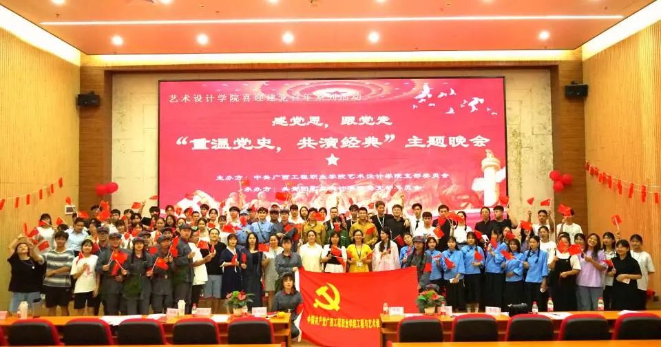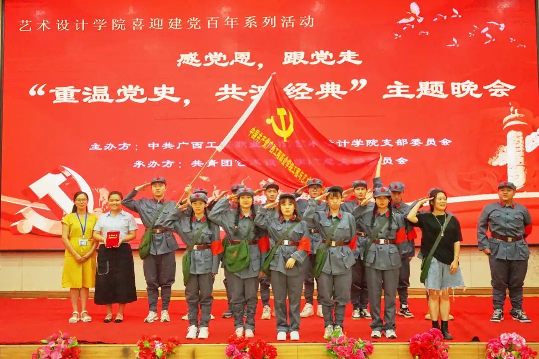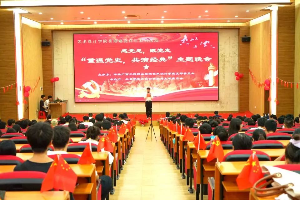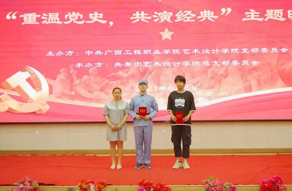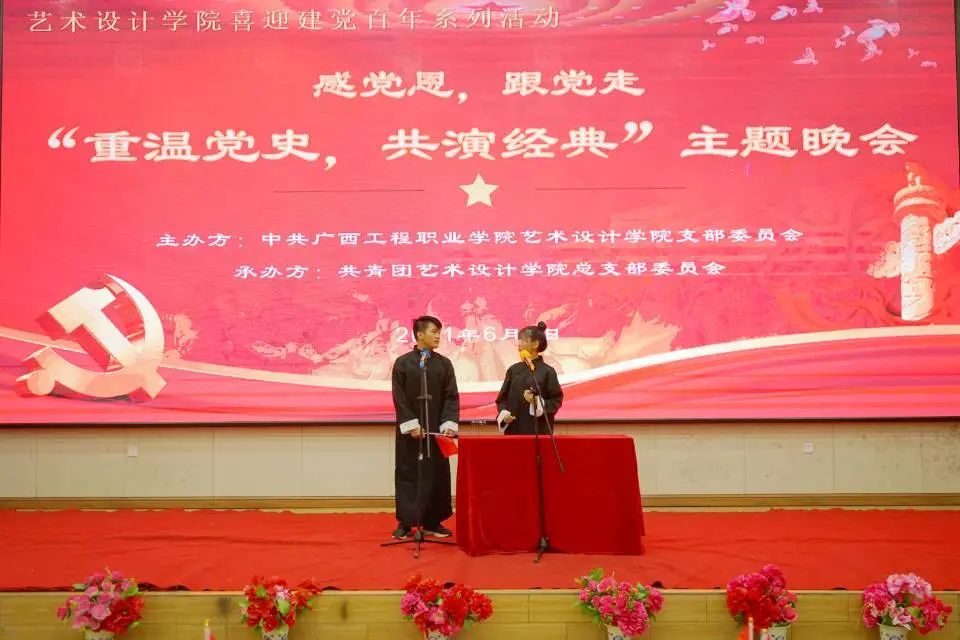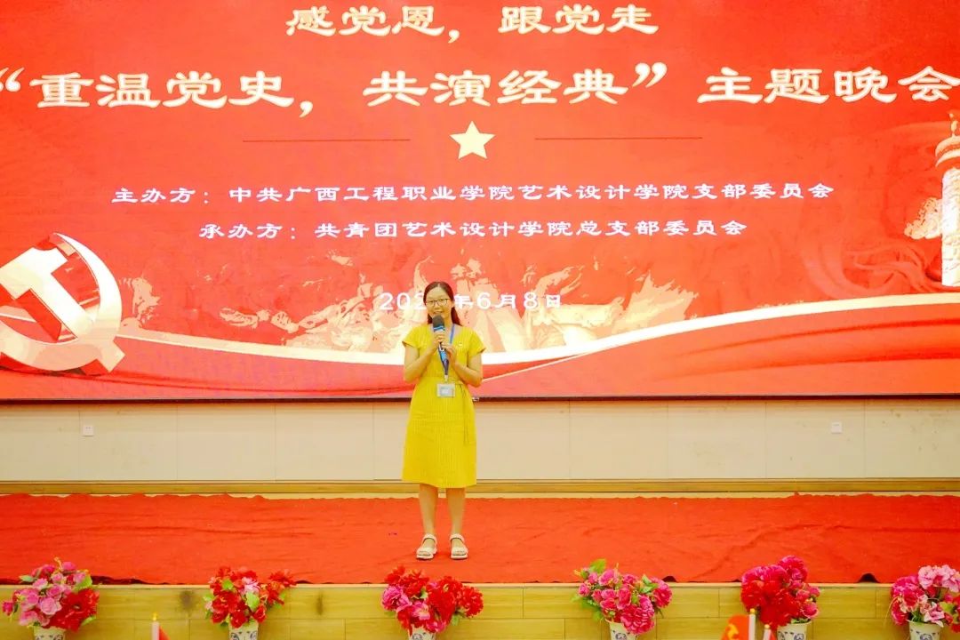 2021年6月8日晚,藝術(shù)設(shè)計學(xué)院在圖文信息大樓一樓學(xué)術(shù)報告廳舉辦了聽黨話、感黨恩、跟黨走——“重溫黨史,共演經(jīng)典”主題晚會。出席晚會現(xiàn)場的領(lǐng)導(dǎo)有學(xué)校副校長林萌,藝術(shù)設(shè)計學(xué)院黨支部書記、副院長覃鳳姣,黨支部委員陸閑,黨支部委員、辦公室主任王艷,分團委書記潘翠萍,教研室主任李花,黨支部全體師生黨員、黨員發(fā)展對象、入黨積極分子等也觀看了本次晚會。