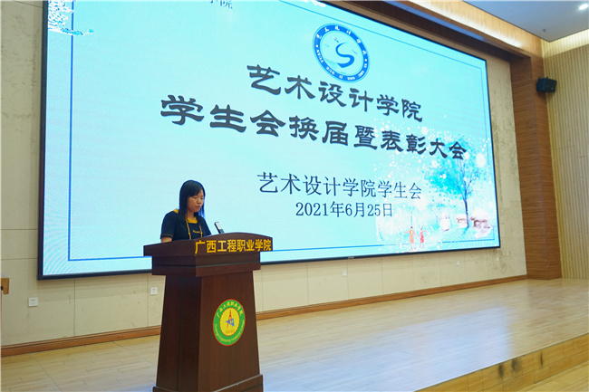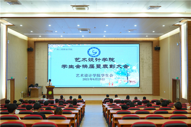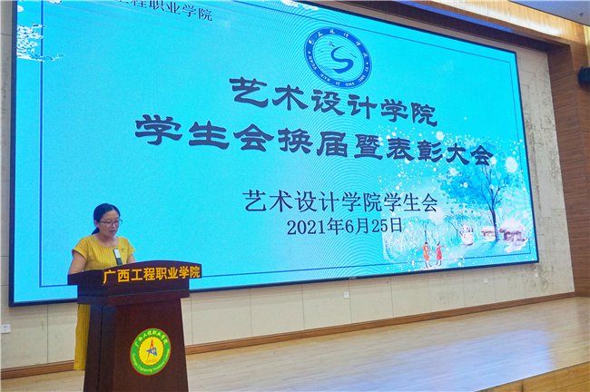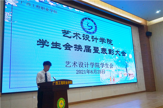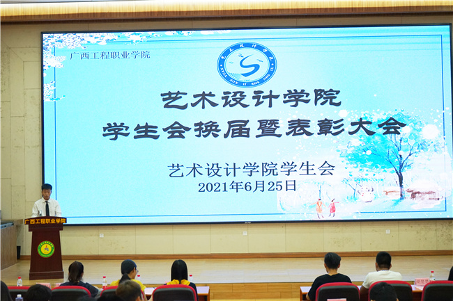 2021年6月25日晚,廣西工程職業(yè)學(xué)院藝術(shù)設(shè)計學(xué)院學(xué)生會在圖文信息大樓一樓報告廳召開了第六屆學(xué)生會換屆暨表彰大會。出席本次大會的領(lǐng)導(dǎo)老師有學(xué)校副校長林萌、藝術(shù)設(shè)計學(xué)院黨支部書記、副院長覃鳳姣、校團委陳威老師、藝術(shù)設(shè)計學(xué)院分團委書記潘翠萍老師、土木工程學(xué)院分團委書記陳春任以及藝術(shù)設(shè)計學(xué)院全體輔導(dǎo)員、學(xué)校各社團代表等參加大會,本次大會由鄭智元主持。