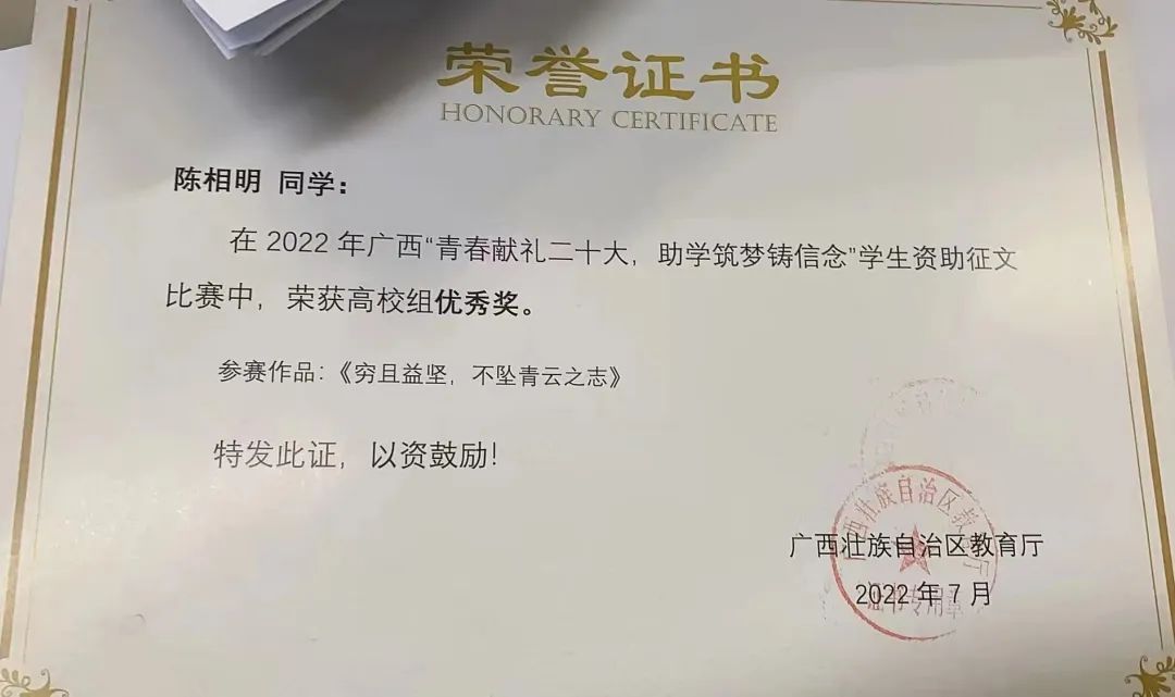 2022年廣西“青春獻(xiàn)禮二十大,助學(xué)筑夢鑄信念”學(xué)生資助征文比賽(廣西壯族自治區(qū)教育廳主辦)