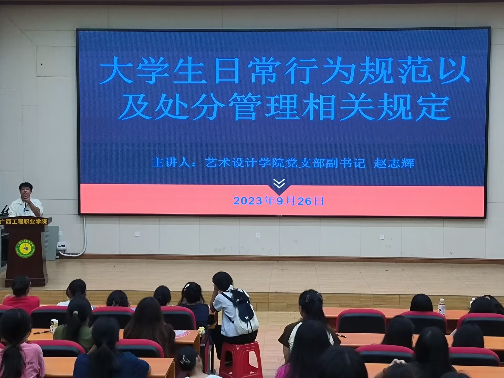 良好的生活習(xí)慣是確保順利、成功度過(guò)大學(xué)學(xué)習(xí)生涯的一個(gè)重要基礎(chǔ),為了讓使2023級(jí)新生的大學(xué)生活過(guò)得更加充實(shí)、美好,培養(yǎng)新生良好的生活習(xí)慣,2023年9月26日上午,藝術(shù)設(shè)計(jì)學(xué)院在學(xué)校圖文信息大樓學(xué)術(shù)報(bào)告廳開(kāi)展了召“大學(xué)生日常行為規(guī)范以及處分管理相關(guān)規(guī)定”專(zhuān)題培訓(xùn),本場(chǎng)專(zhuān)題培訓(xùn)由學(xué)院黨支部副書(shū)記趙志輝主講,2023級(jí)全體新生參加了此次培訓(xùn)。