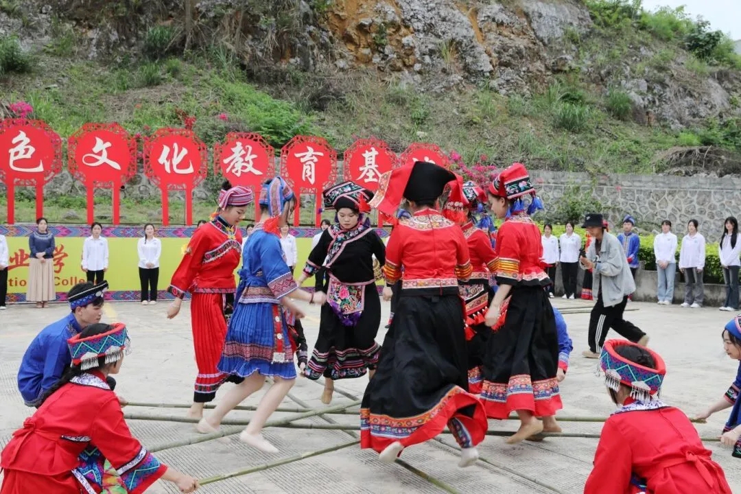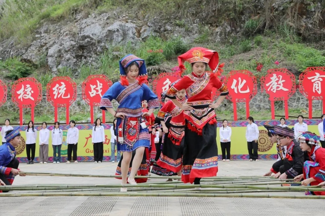 在輕快的竹竿敲擊節(jié)奏中,師生們身著美麗的民族服飾,跳起歡樂的竹竿舞。