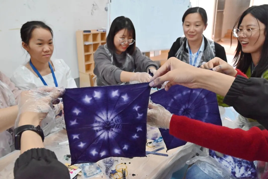 扎染工藝分為扎結(jié)和染色兩部分,學(xué)生們用紗線、皮筋將棉布捆扎成不同的花紋,浸入染料中,通過不同的著色、脫色,形成層次豐富、令人驚嘆的色暈和圖案。