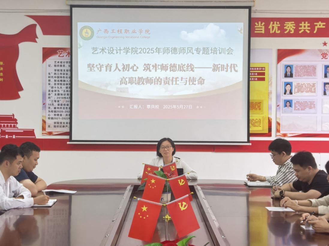 為全面貫徹黨的教育方針,深化新時(shí)代教師隊(duì)伍建設(shè),全面提升教師職業(yè)道德素養(yǎng),強(qiáng)化教師立德樹人的責(zé)任感和使命感,藝術(shù)設(shè)計(jì)學(xué)院于2025年5月27日14:30在學(xué)院三樓黨員活動(dòng)室召開了全體教職工師德師風(fēng)專題培訓(xùn)會(huì)。此次培訓(xùn)會(huì)由學(xué)院黨支部書記、院長覃鳳姣主講,學(xué)院全體教師參加。