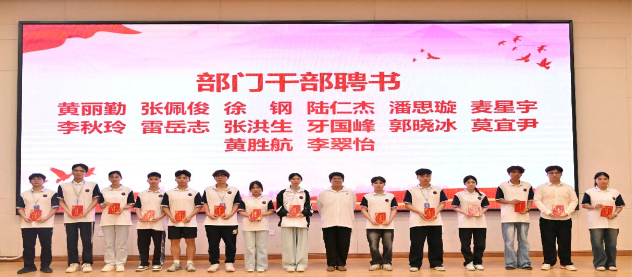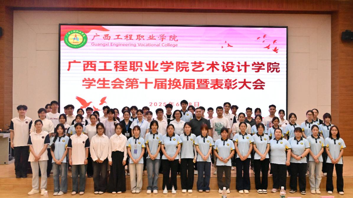 2025年6月8日下午,藝術設計學院第十屆學生會換屆暨表彰大會在圖文信息大樓三樓學術報告廳順利召開。出席本次大會的有藝術設計學院黨支部書記兼院長覃鳳姣、黨支部副書記趙志輝、分團委書記李東英、辦公室主任陳國昇、學院全體輔導員、學生會代表、第十屆團學干部以及新當選的第十一屆團學干部。