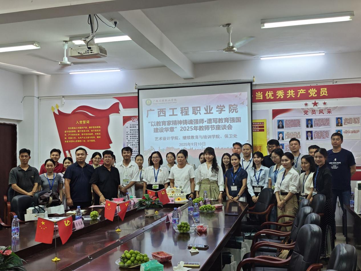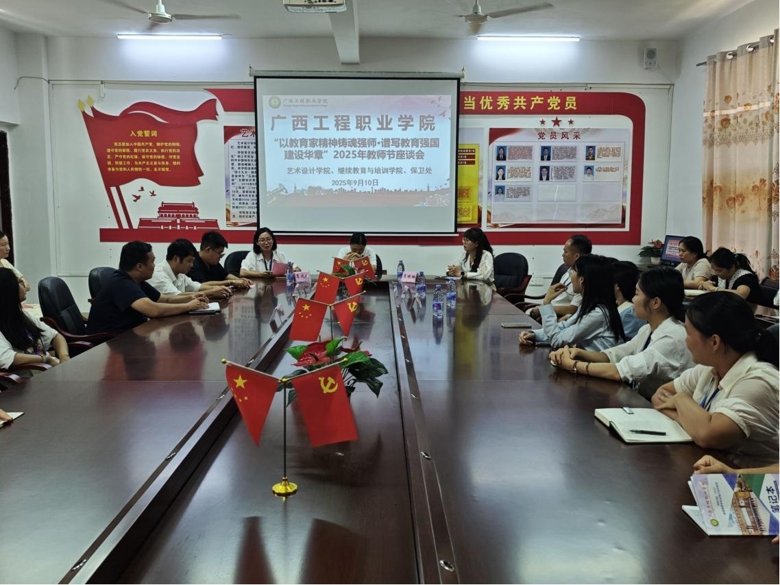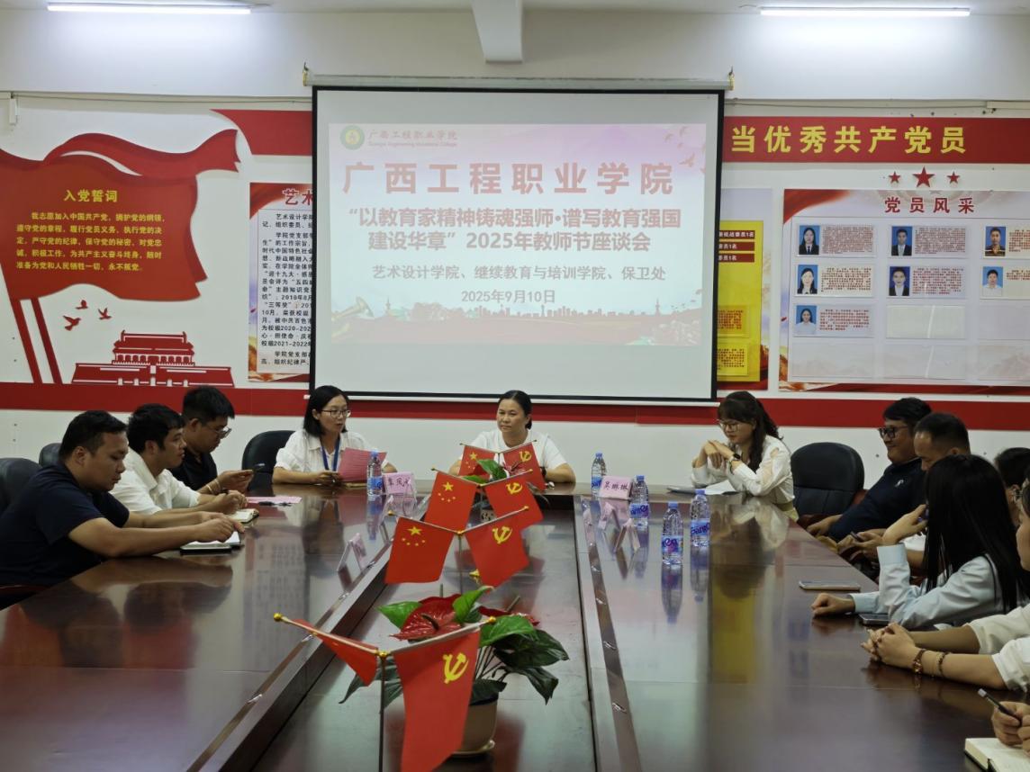 2025年9月10日下午,藝術(shù)設(shè)計(jì)學(xué)院、保衛(wèi)處、繼續(xù)教育與培訓(xùn)學(xué)院聯(lián)合在藝術(shù)設(shè)計(jì)學(xué)院304黨員活動(dòng)室召開2025年“以教育家精神鑄魂強(qiáng)師·譜寫教育強(qiáng)國(guó)建設(shè)華章”主題教師節(jié)座談會(huì),共同慶祝第41個(gè)教師節(jié)。學(xué)校校長(zhǎng)助理梁善雅,藝術(shù)設(shè)計(jì)學(xué)院黨支部書記、院長(zhǎng)覃鳳姣,繼續(xù)教育與培訓(xùn)學(xué)院院長(zhǎng)吳琳琳、保衛(wèi)處副處長(zhǎng)王冬冬與三部門全體教師歡聚一堂,深入學(xué)習(xí)領(lǐng)會(huì)習(xí)近平總書記關(guān)于教育的重要論述精神,暢談?dòng)诵牡?,凝聚發(fā)展共識(shí),現(xiàn)場(chǎng)氣氛莊重而熱烈。座談會(huì)由藝術(shù)設(shè)計(jì)學(xué)院黨支部副書記趙志輝主持。