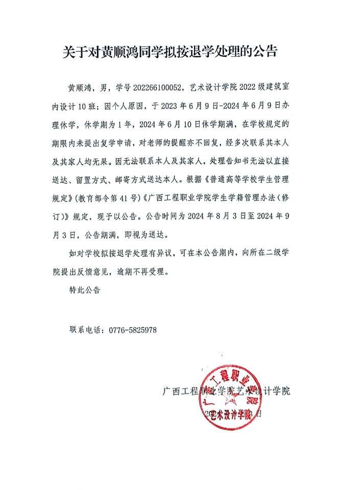關(guān)于對(duì)黃順鴻同學(xué)擬按退學(xué)處理的公告