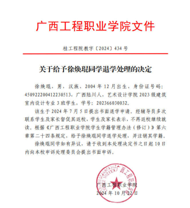 根據(jù)《普通高等學(xué)校學(xué)生管理規(guī)定》(教育部令第41號)、《廣西工程職業(yè)學(xué)院學(xué)生學(xué)籍管理辦法(修訂)》第二十四條規(guī)定,給予徐煥琨同學(xué)退學(xué)處理,并注銷其學(xué)籍。