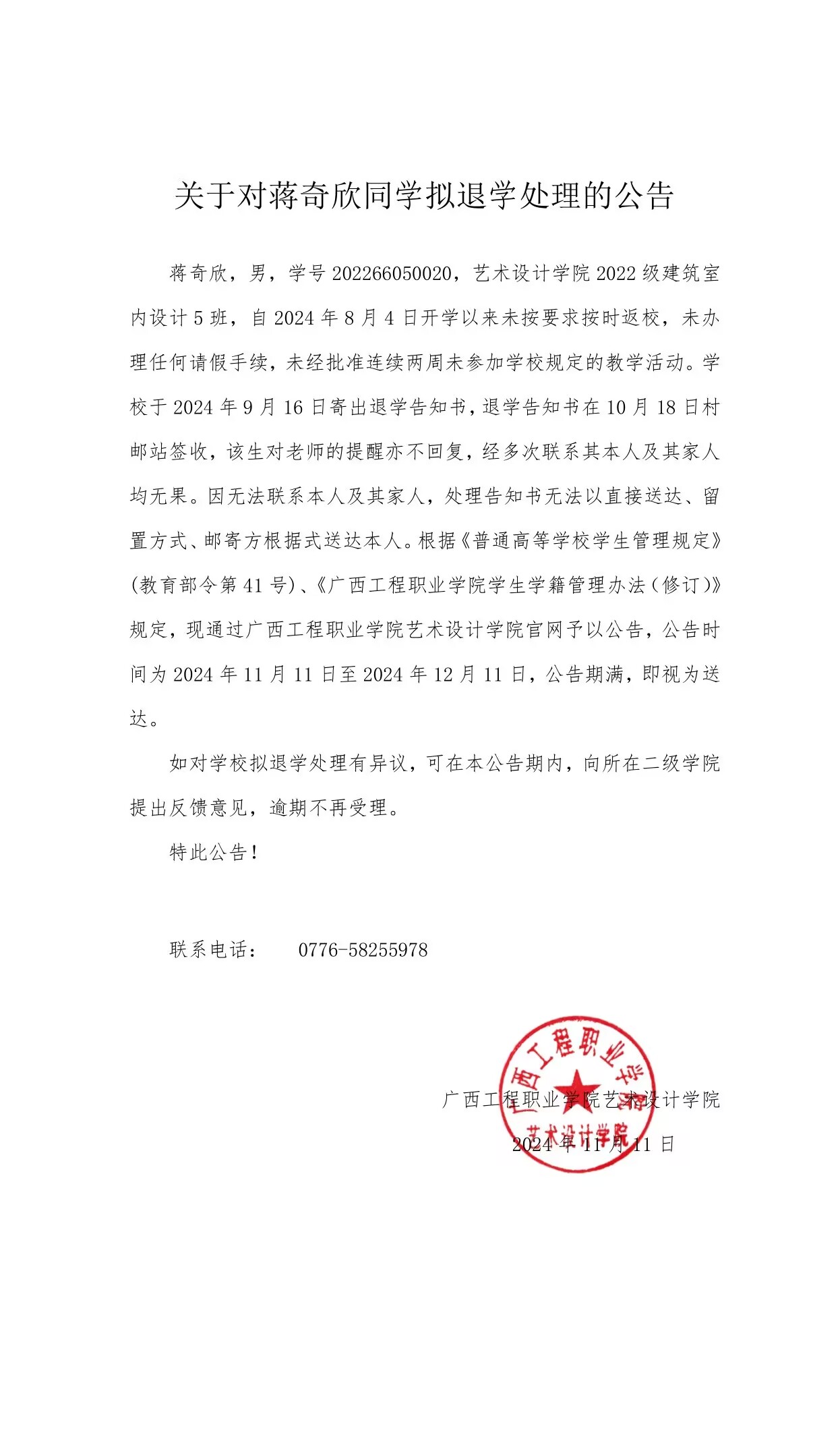 關(guān)于對(duì)蔣奇欣同學(xué)擬退學(xué)處理的公告