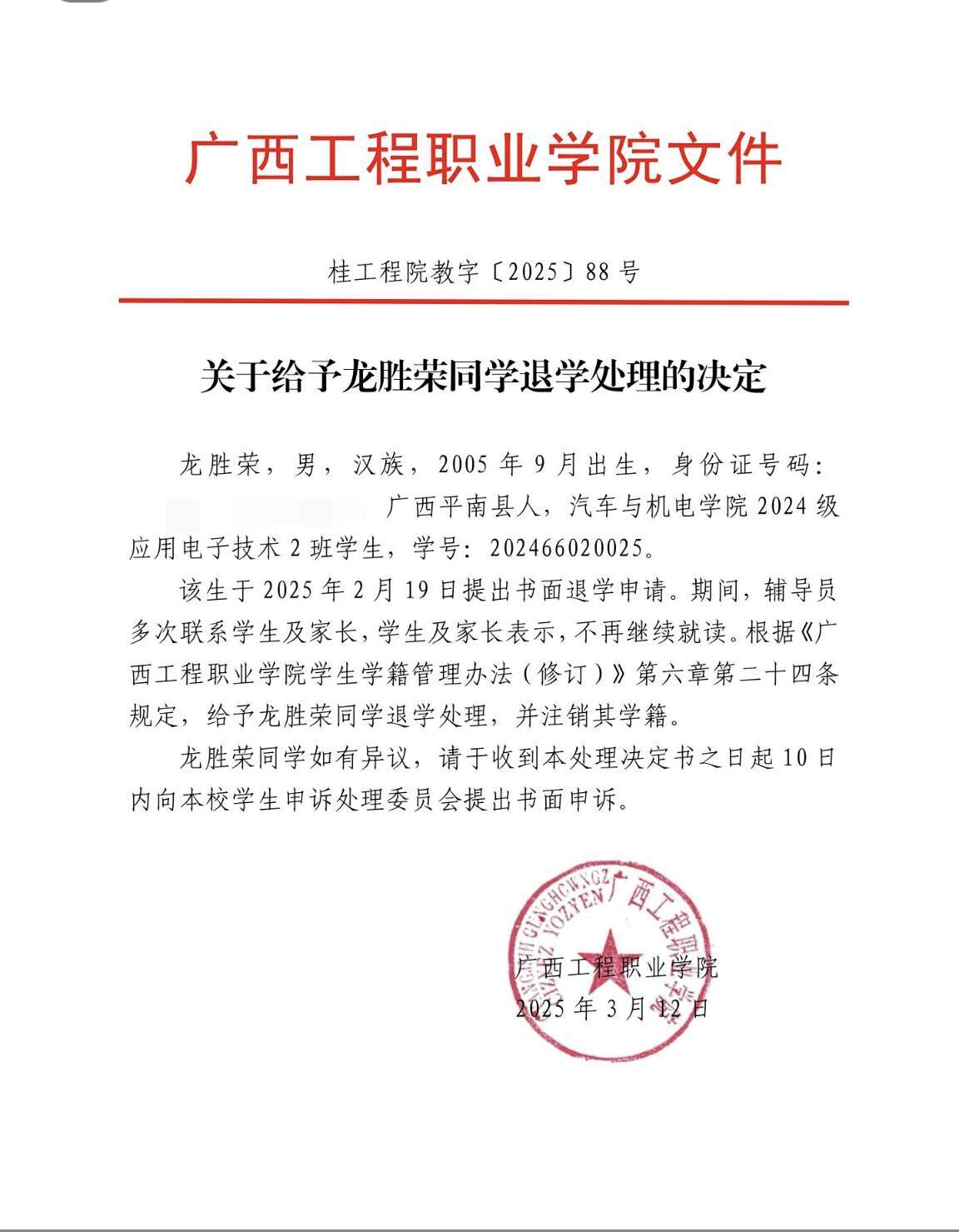 根據(jù)《普通高等學(xué)校學(xué)生管理規(guī)定》(教育部令第41號(hào))、《廣西工程職業(yè)學(xué)院學(xué)生學(xué)籍管理辦法(修訂)》第二十四條規(guī)定,給予龍勝榮同學(xué)退學(xué)處理,并注銷其學(xué)籍。