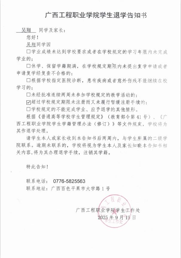吳翔,男,學(xué)號(hào):202466020004,藝術(shù)設(shè)計(jì)學(xué)院2024級(jí)建筑室內(nèi)設(shè)計(jì)2班學(xué)生;于2025年8月31日開學(xué)至今未返校,超過學(xué)校規(guī)定期限未注冊(cè)而又未履行暫緩注冊(cè)手續(xù),對(duì)老師的提醒亦不回復(fù),經(jīng)多次聯(lián)系其本人及其家人均無(wú)果。學(xué)校于2025年9月16日郵寄退學(xué)告知書,因不是學(xué)生本人及其家人簽收,處理告知書無(wú)法以直接送達(dá)、留置方式、郵寄方式送達(dá)本人。根據(jù)《普通高等學(xué)校學(xué)生管理規(guī)定》(教育部令第41號(hào))、《廣西工程職業(yè)學(xué)院學(xué)生學(xué)籍管理辦法(修訂)》規(guī)定,現(xiàn)通過廣西工程職業(yè)學(xué)院藝術(shù)設(shè)計(jì)學(xué)院官網(wǎng)予以公告,公告時(shí)間為2025年9月26日至2025年10月25日,公告期滿,即視為送達(dá)。